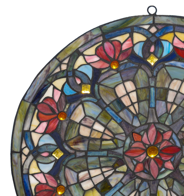 ROUND LEADED SLAG GLASS WINDOW: Contemporary manufacture polychrome floral and geometric motifs with varying colors of slag glass and inset glass jewels, currently with 2 rings attached for hanging, 24'' dia.