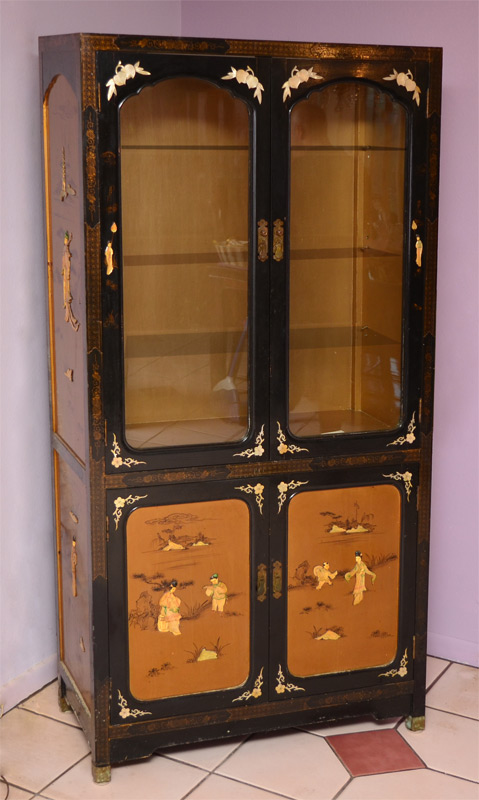 STONE INLAY CHINOISERIE DISPLAY CABINET: Illuminated top with mother of pearl and stone inlay figures, 2 glass doors, 3 glass shelves. Over 2 blind doors with gilt painted scenes and stone inlay, mother of pearl accents at corners. Sides with matching gilt and stone decoration. Measures 72'' h. x 36'' x 16''