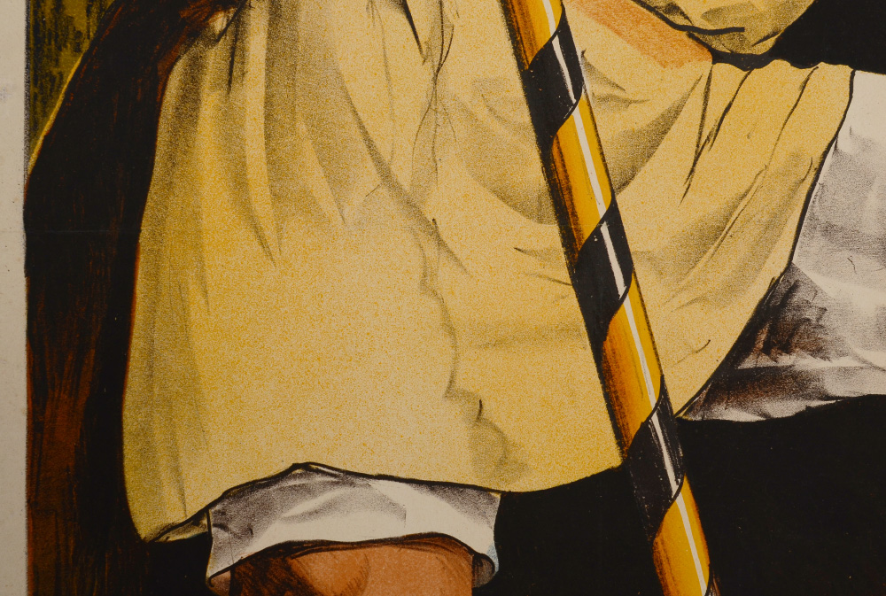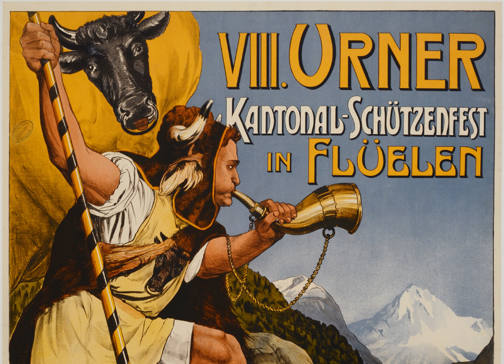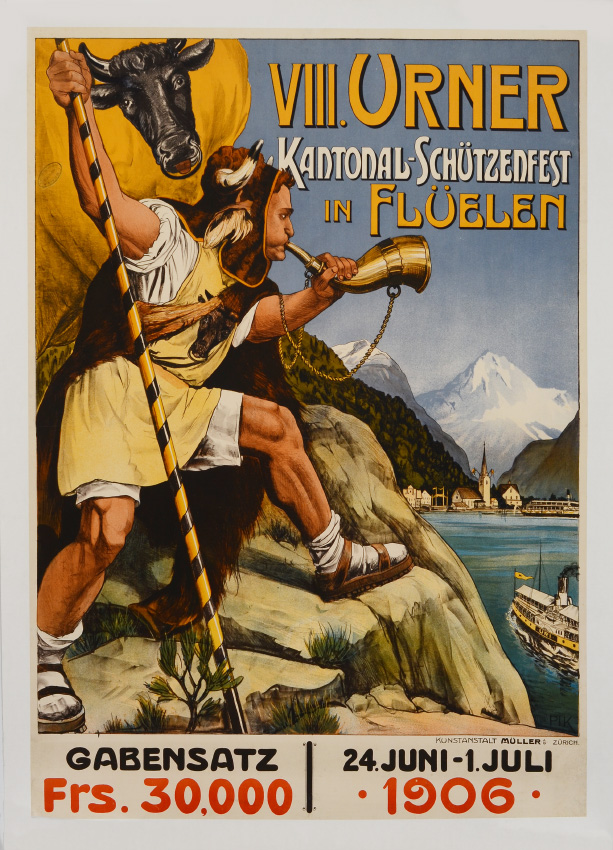 KRAWUTSCHKE, Paul, A.K.A. PIK, (German, 1865-): 1906 German Lithograph poster ''VIII. Urner Kantonal-Schutzenfest in Fuelen, 24. Juni - 1. Juli 1906'' with figure of man blowing a horn. 45 3/4'' x 33'', backed with linen 48 1/2'' x 36 1/4''.