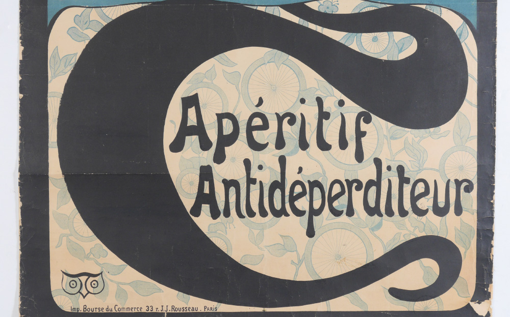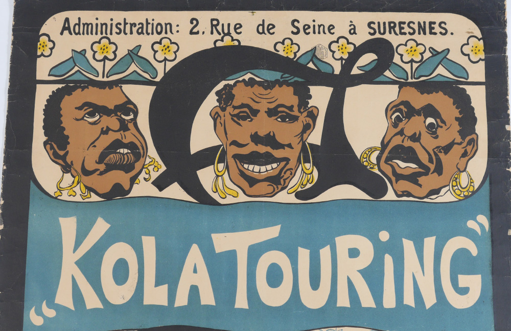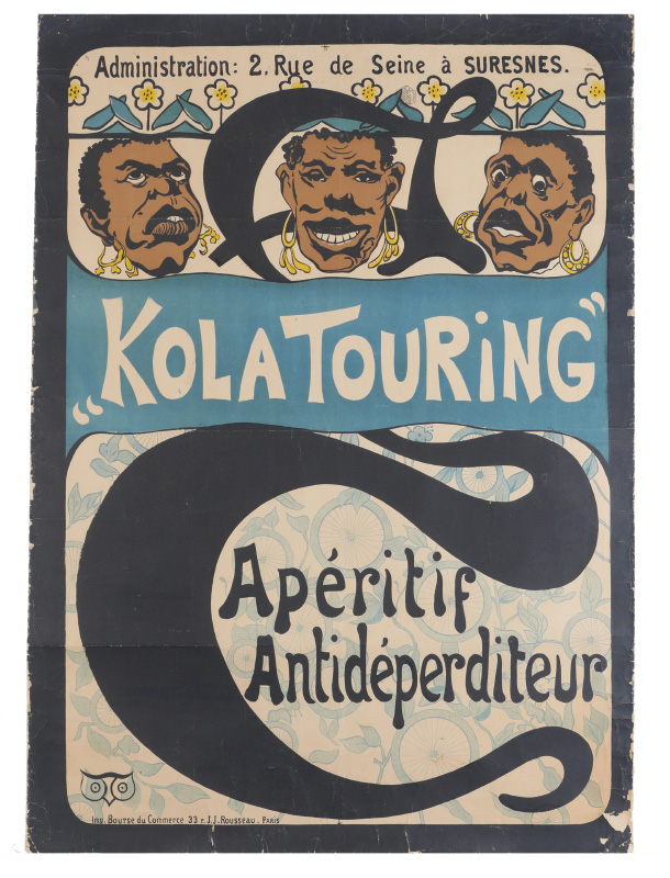 RARE FRENCH KOLA TOURING ADVERTISING POSTER: Lithograph figures of 3 African men busts over phrase ''Kola Touring Aperitif Antideperditeur'', 50 1/4'' x 36'', backed with linen.