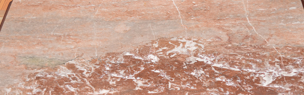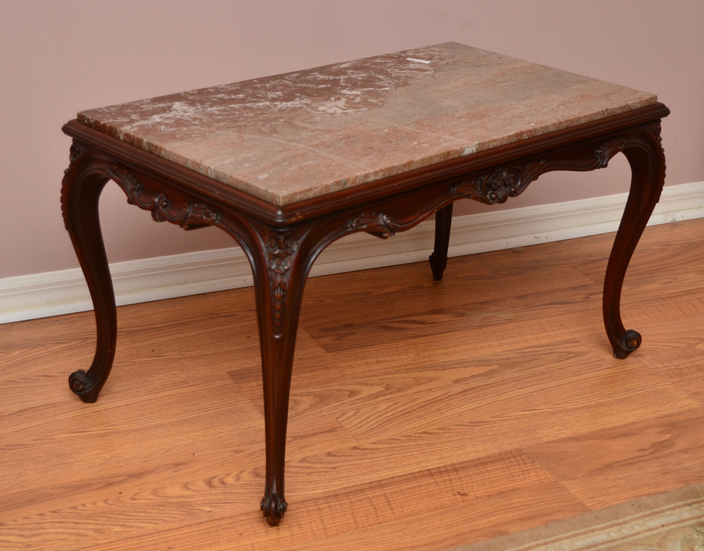 CARVED MARBLE TOP COFFEE TABLE: Inset variegated marble top, carved and shaped skirt and legs ending in scroll feet. Overall measures 19'' h. x 34'' x 20''.