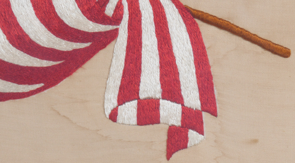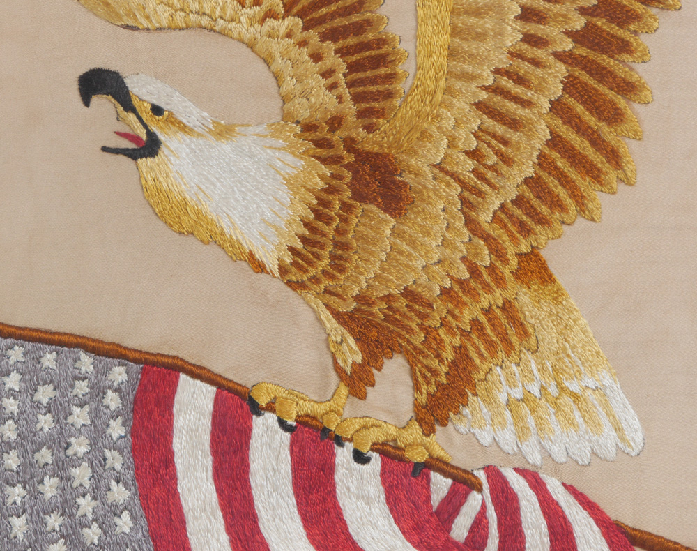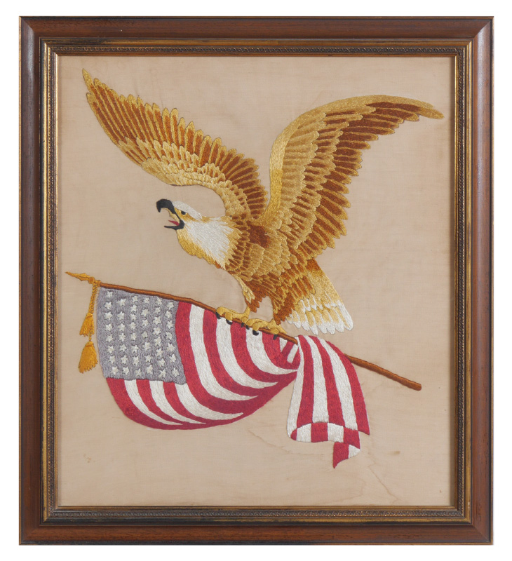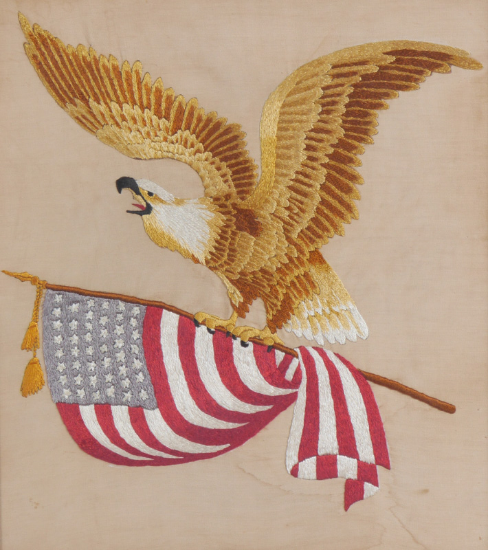 EAGLE AND AMERICAN FLAG NEEDLE WORK: Hand worked silk on silk embroidery. Framed under glass. Overall measures 22 3/4'' x 20 1/2''.