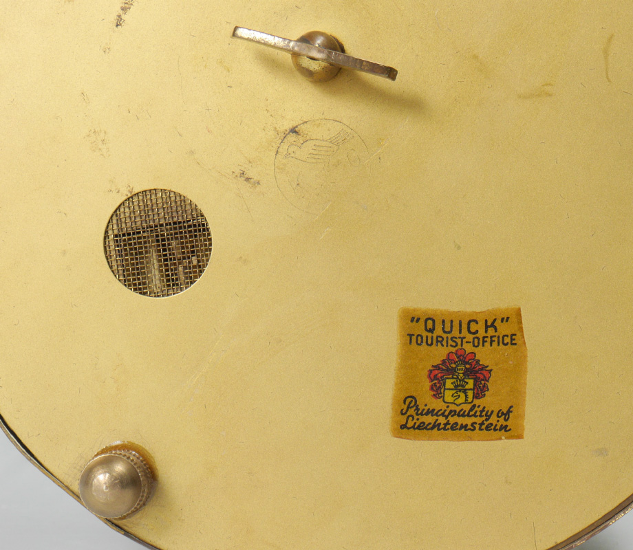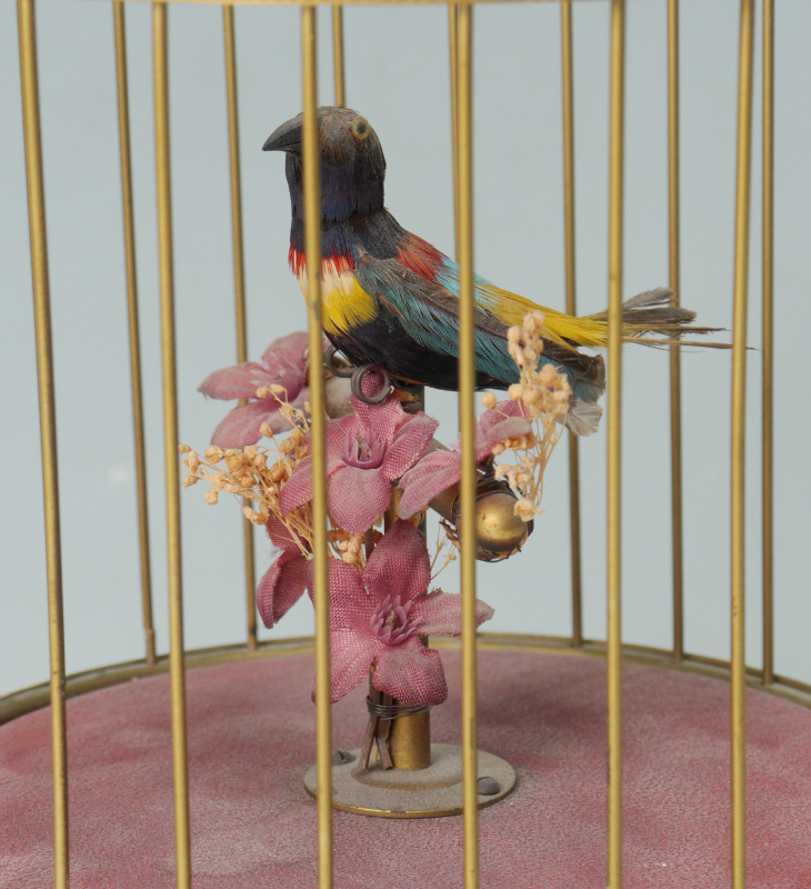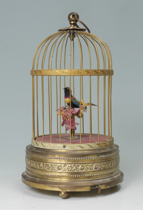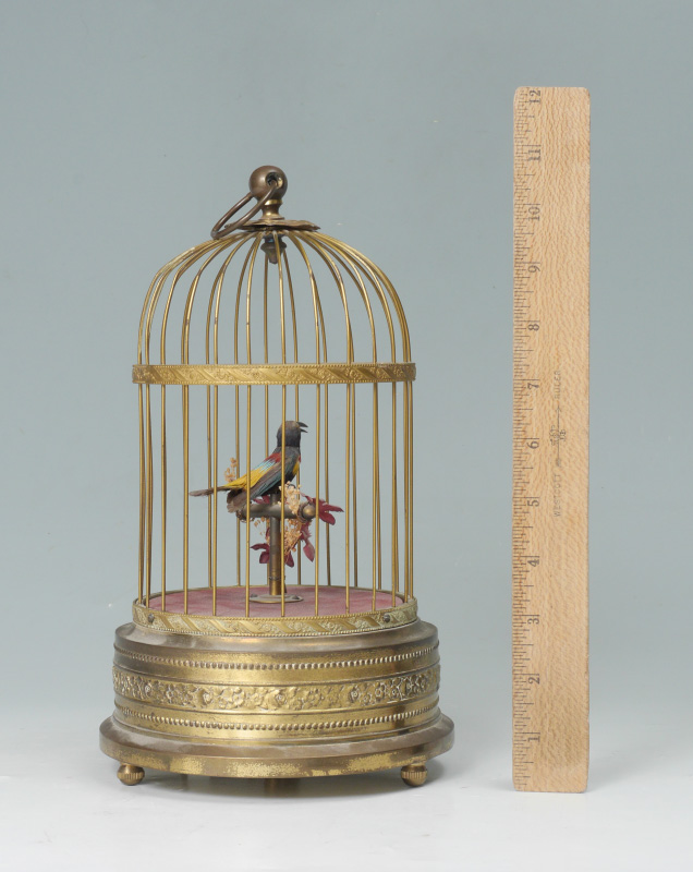 SINGING BIRD IN CAGE AUTOMATON: Single bird with vibrant colors gilt brass cage with embossed base. Currently working fine with movement and bellows chirping. Label on base reads ''Quick'' Tourist Office, Principality of Lichtenstein. Measures 11'' h. x 6 1/2''.