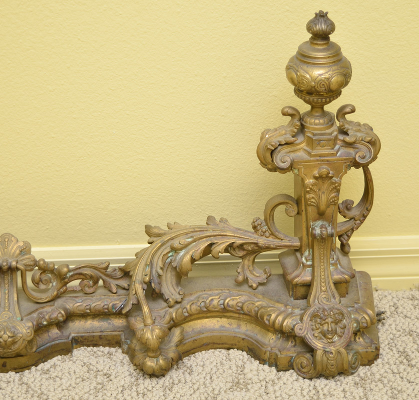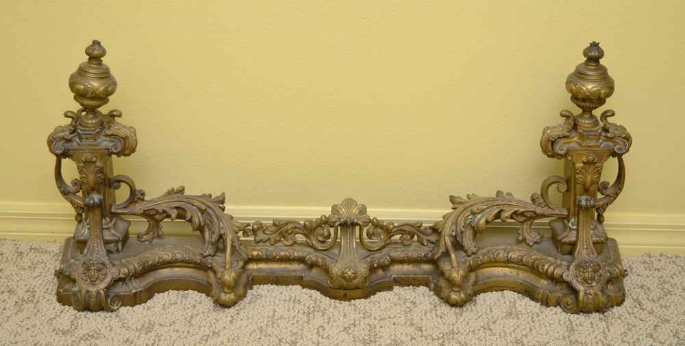 ROCOCO STYLE BRASS FIREPLACE FENDER: Heavy cast brass with urn finials, foliate and masquerons. Approx. 17 1/2'' x. 42'' x 7''.