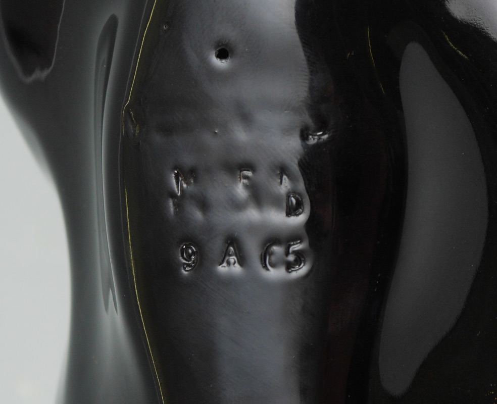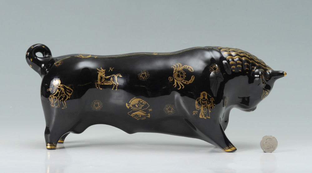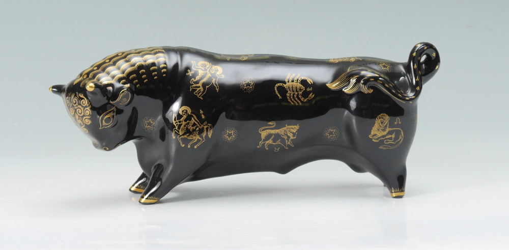 WEDGWOOD BLACK ZODIAC BULL: Black glaze with gilt signs of the Zodiac decoration. Impressed marks under chest. Overall measurers 5 3/4'' h. x 14 1/4''.