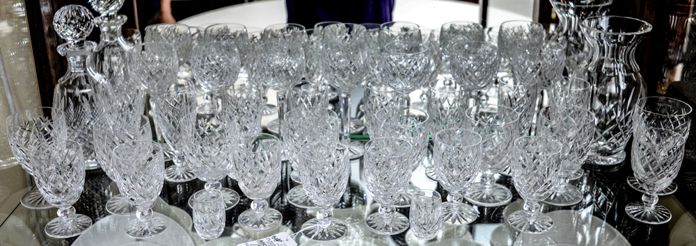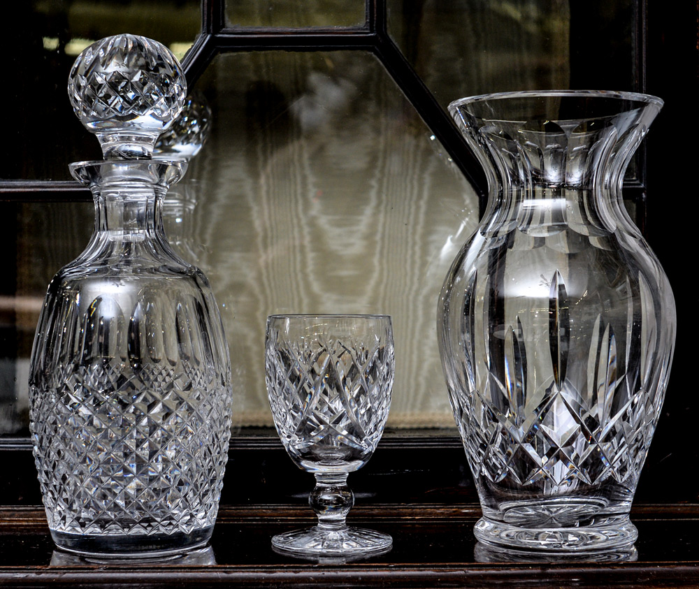31 PIECES WATERFORD DONEGAL CRYSTAL: 35 pieces total, 31 in the Donegal pattern by Waterford to include 7 wine hocks (7 3/8''), 8 fluted champagne (6''), 8 water (5 1/4''), 8 claret wines (4 3/4''). Sold with 2 cordial glasses (2 1/2''), a vase (9''), and a decanter with stopper in other patterns by Waterford.