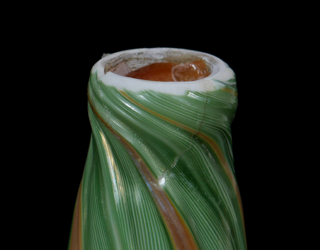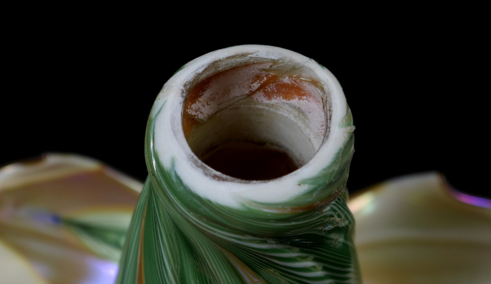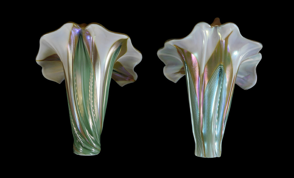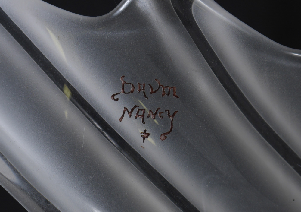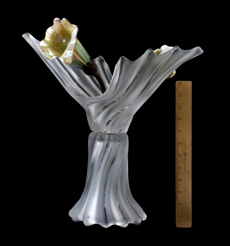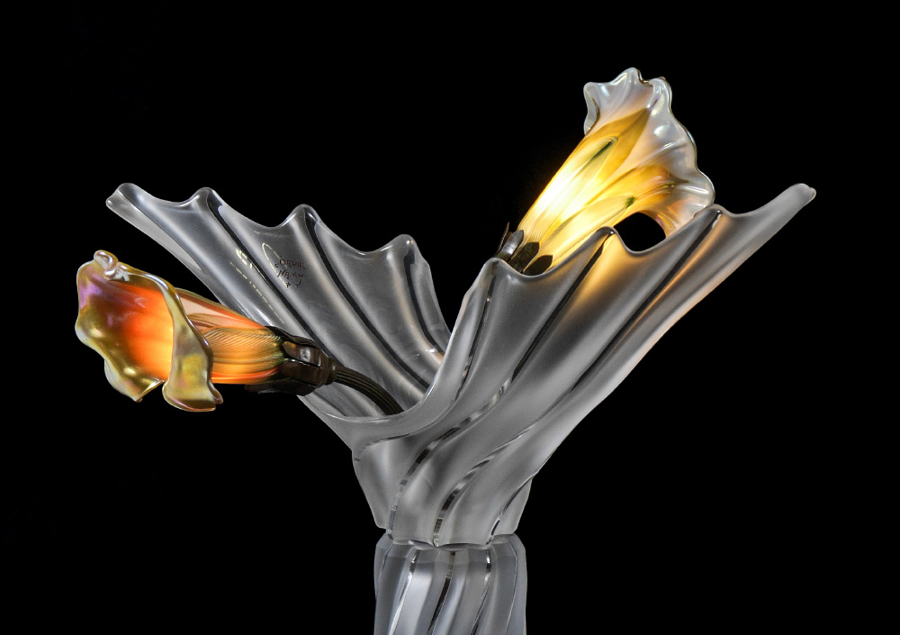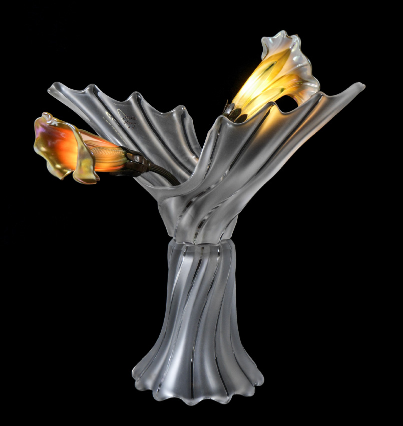 FROSTED GLASS LAMP SIGNED DAUM NANCY: Free form fluted lamp, spurious Daum Nancy signature. 2 socket fixture with pulled feather iridescent floriform shades. 15 1/4'' h. x 15 1/2'' x 6 3/4'', shades 5 1/4'' x 4 1/4'' x 3 3/4'', 1'' rim.