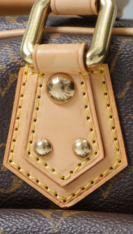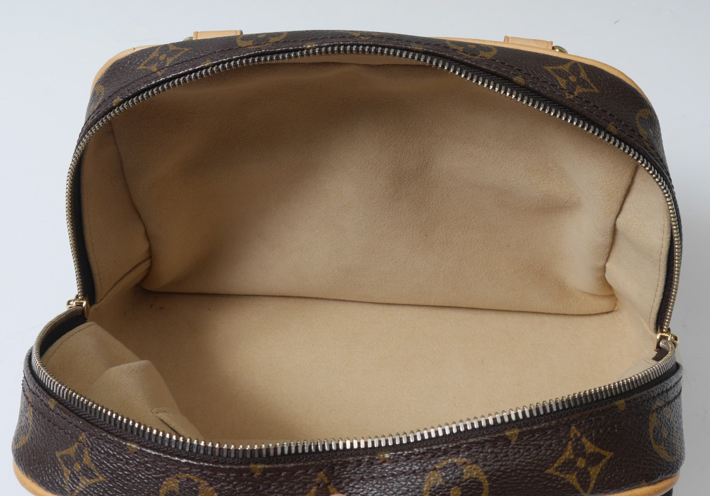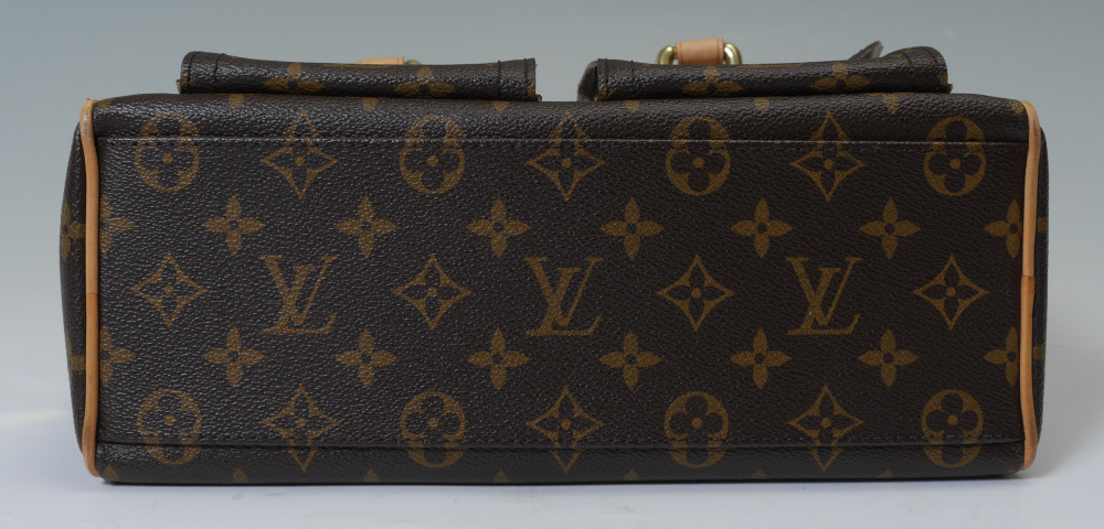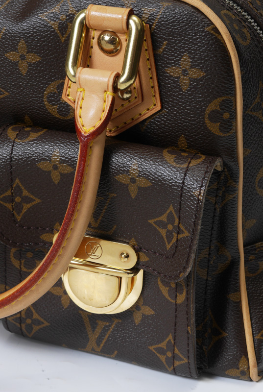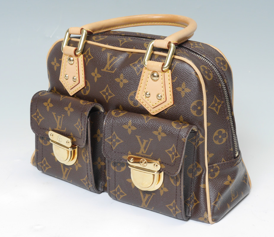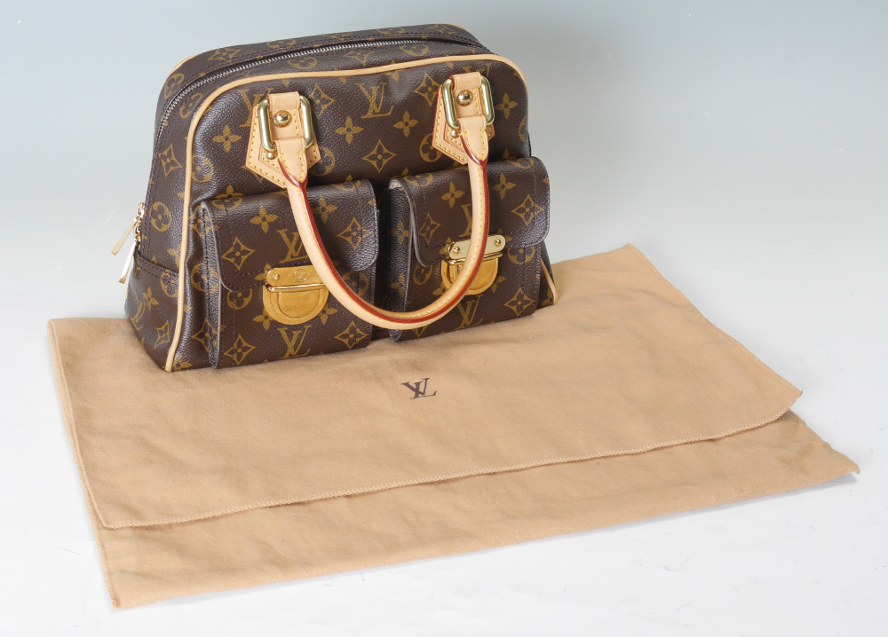 LOUIS VUITTON MANHATTAN PM BAG: Classic monogrammed canvas purse with leather handles and trim. Two small exterior pockets, zipper closure top, alcantara interior with large pocket. Measures approx. 7.5'' high c 12'' x 5.5''. Sold with the dust bag.
