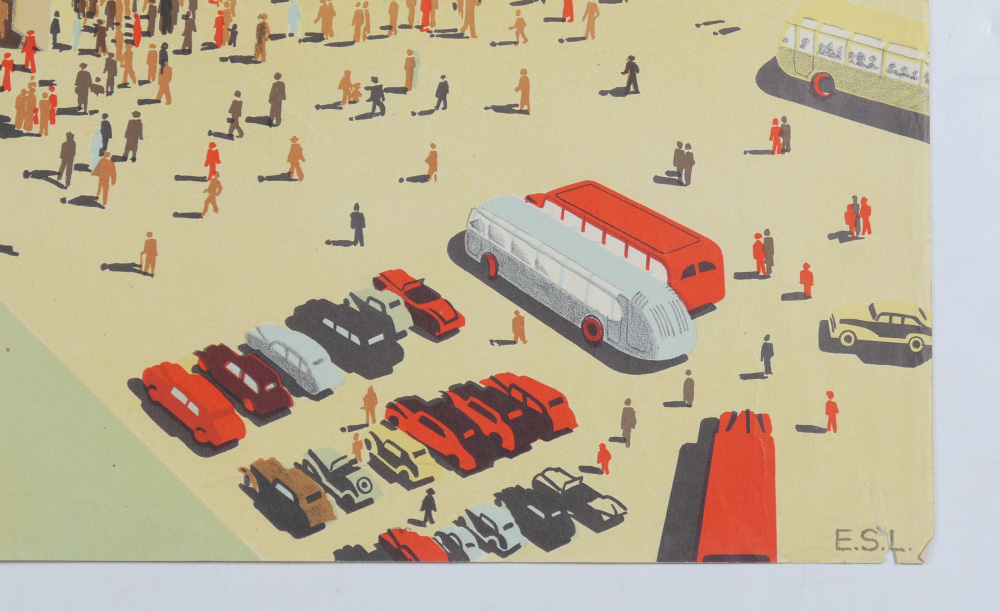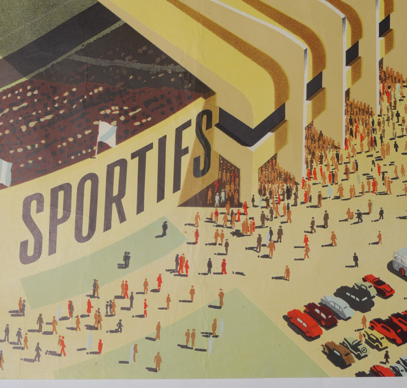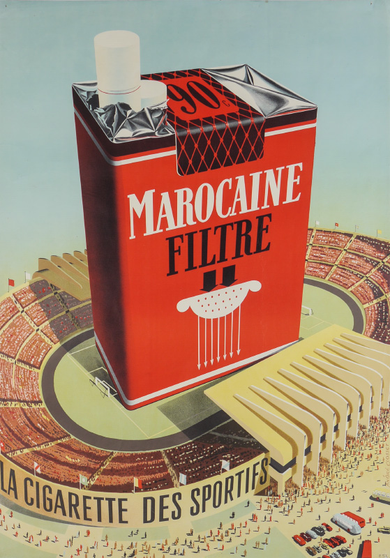 1956 ANDRE CLOSSET MAROCAINE CIGARETTES POSTER: Advertising poster for Marocaine Cigarettes featuring a sports stadium, 50 1/4'' x 35 12''.