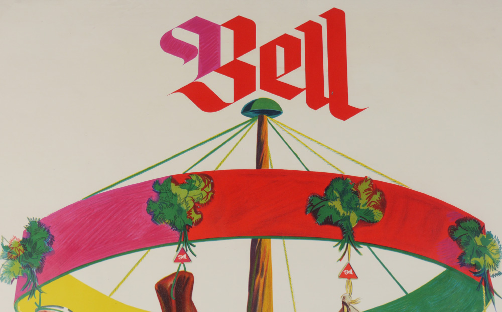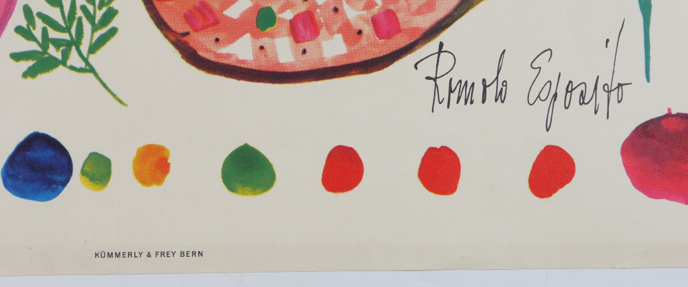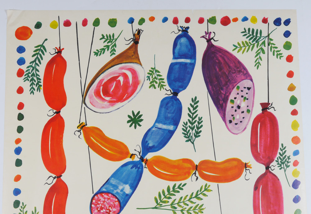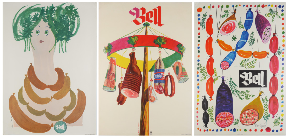 3 VINTAGE BELL SWISS ADVERTISING POSTERS: 3 advertising posters for the Bell meat company from Basel, Switzerland to include 1) 1963 Laura Lamm woman with sausage necklaces, 50 1/4'' x 35 1/2''. 2) 1967 Romolo Esposito hanging meats, 50 1/4'' x 35 1/2''. 3) 1951 Pierre Monnerat hanging meats, 50 1/4'' x 35 1/2''.
