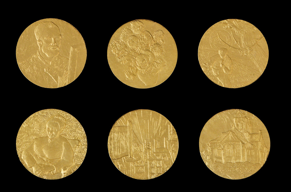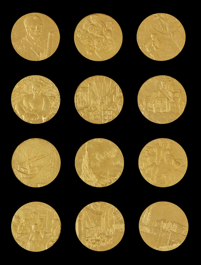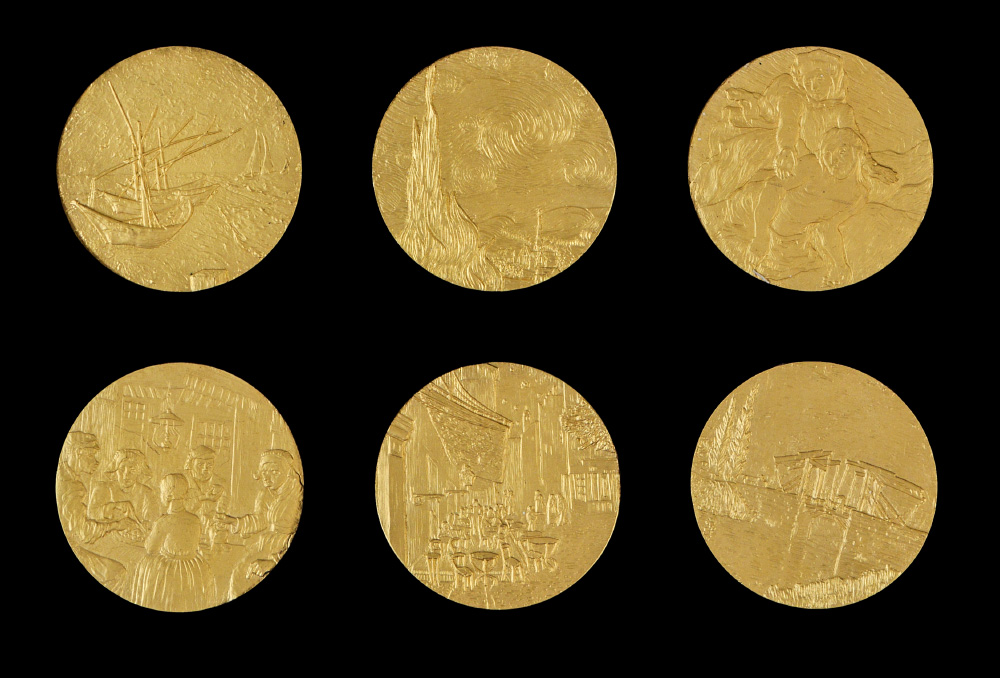 12 GOLD PLATED BRONZE VINCENT VAN GOGH MEDALS: Each with scene from a Van Gogh painting, originally from the Franklin Mint, 2 3/4'' dia. Sold with display mounting in poor condition, 15 1/2'' x 12 1/2''.