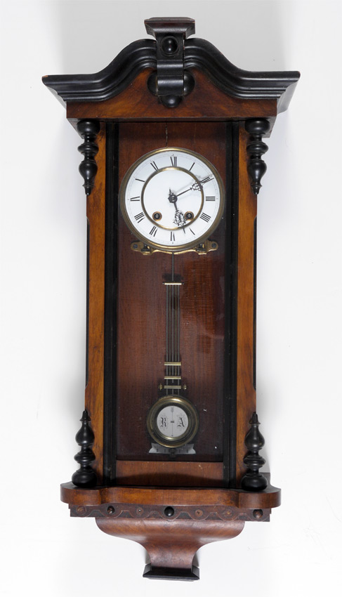 CARVED GERMAN BIEDERMEIER STYLE WALL CLOCK: Biedermeier style walnut case with shaped pediment and applied decorations. Porcelain dial with Roman numerals, Lenzkirch key wind and pendulum time and strike movement. Overall 31'' x 13 1/4'' x 8''.