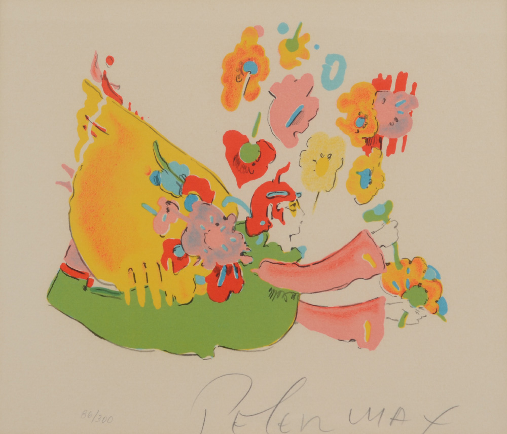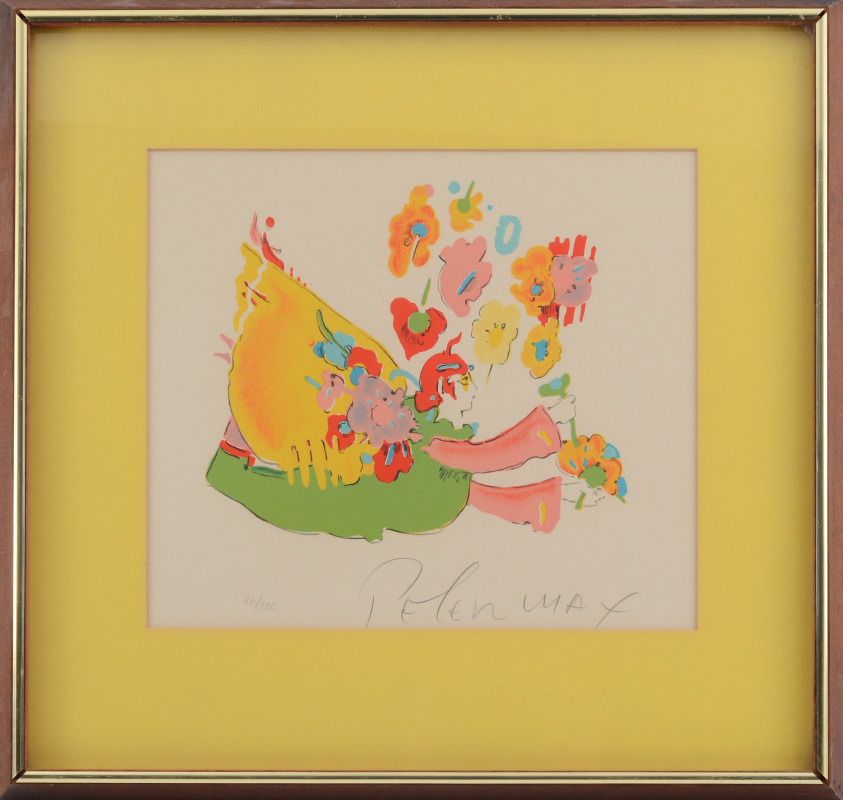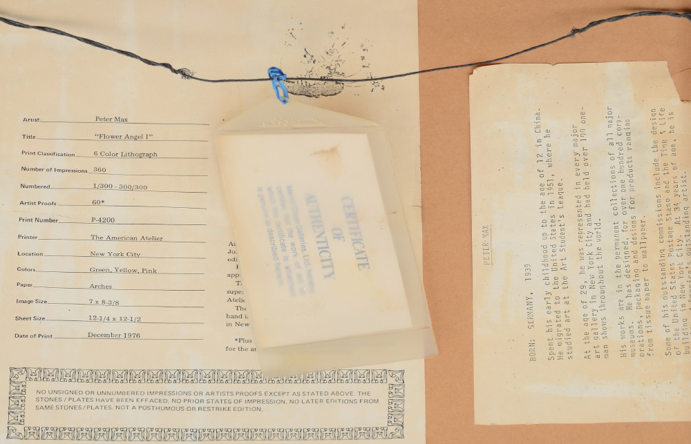 MAX, Peter, (American, 1937- ): ''Flower Angel I'', Six Color Lithograph, sight size 9 1/2'' x 10 3/4'', pencil signed lower right, numbered lower left 86 of 300, Merrill Chase tag verso with label affixed and artist bio, framed, 16'' x 17''.