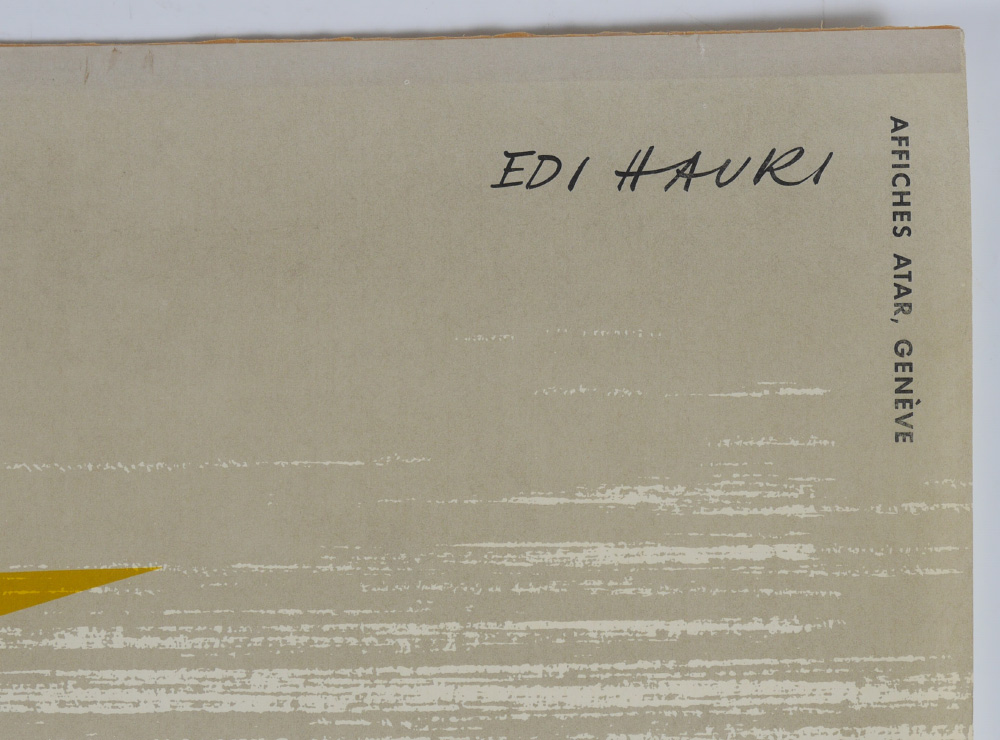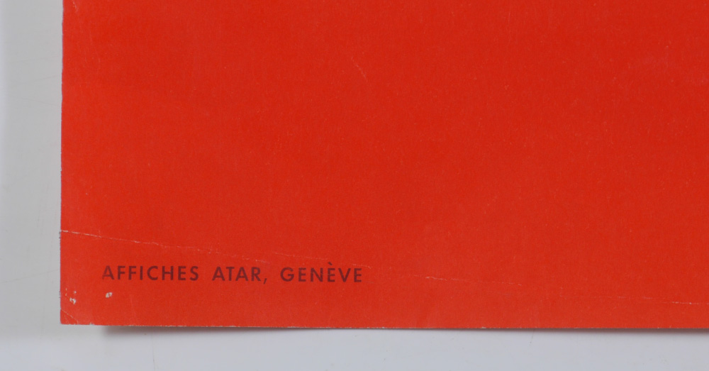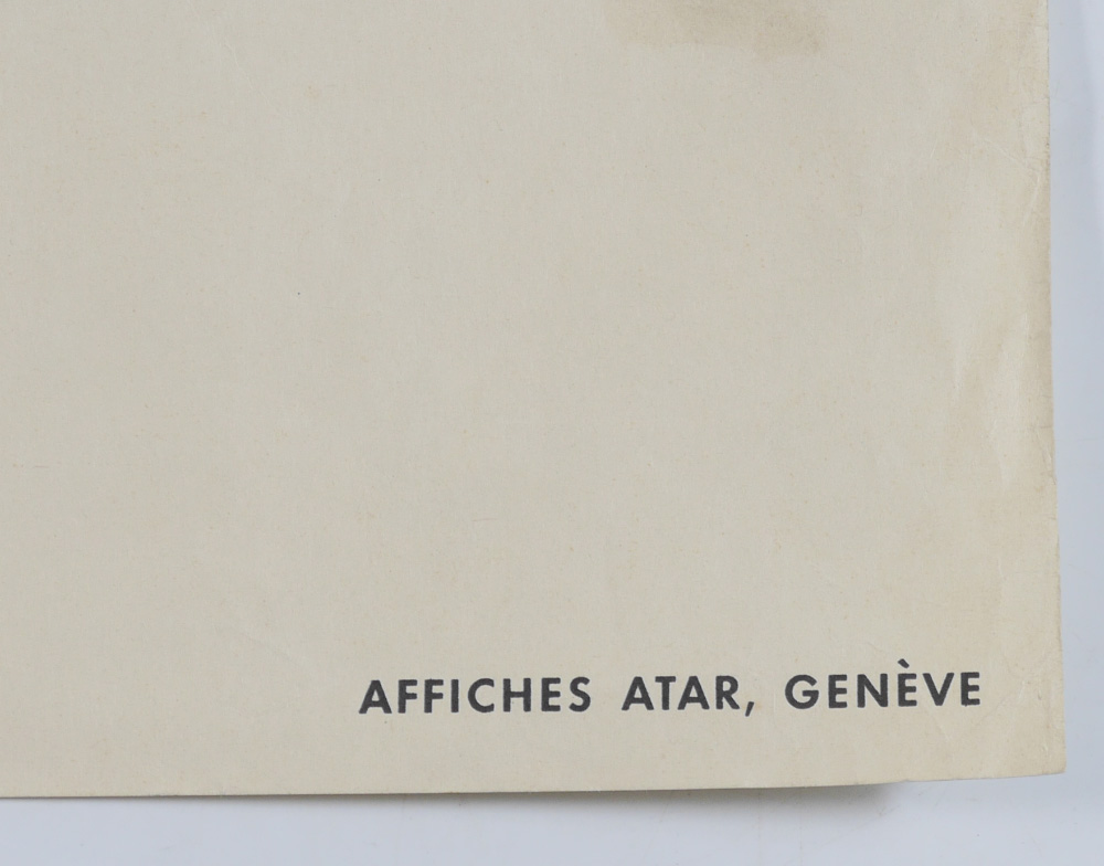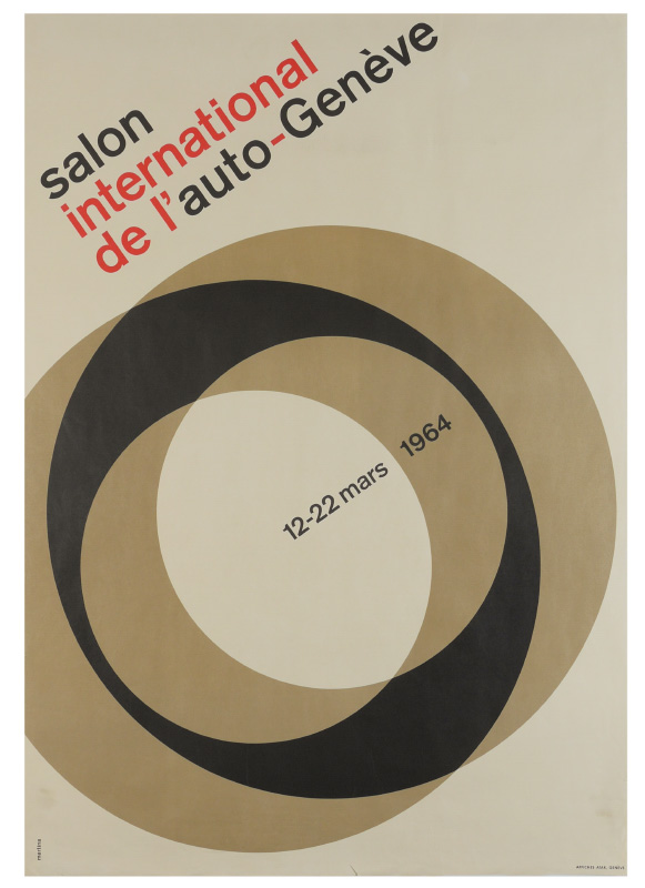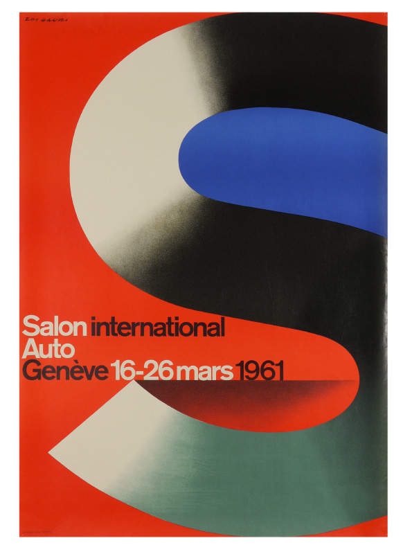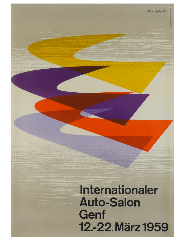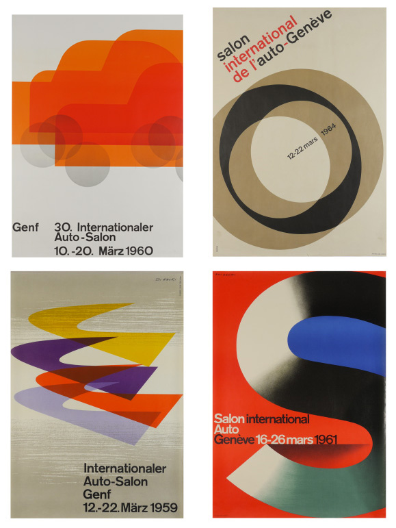 4 VINTAGE GENEVA INTERNATIONAL AUTO SHOW POSTERS: 4 posters total advertising the Geneve International Auto-Salon to include 1) 1959 Edi Hauri design. 2) 1960 Georges Calame design. 3) 1961 Edi Hauri design. 4) 1964 Martina design. Each measures 50 1/4'' x 35 3/4''.
