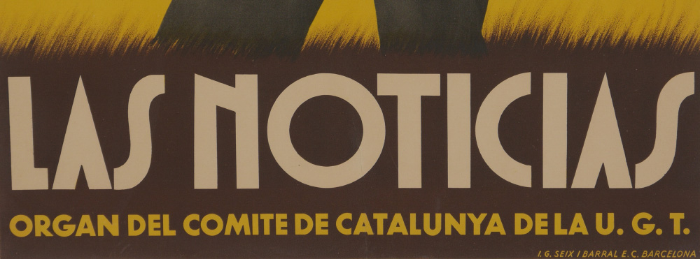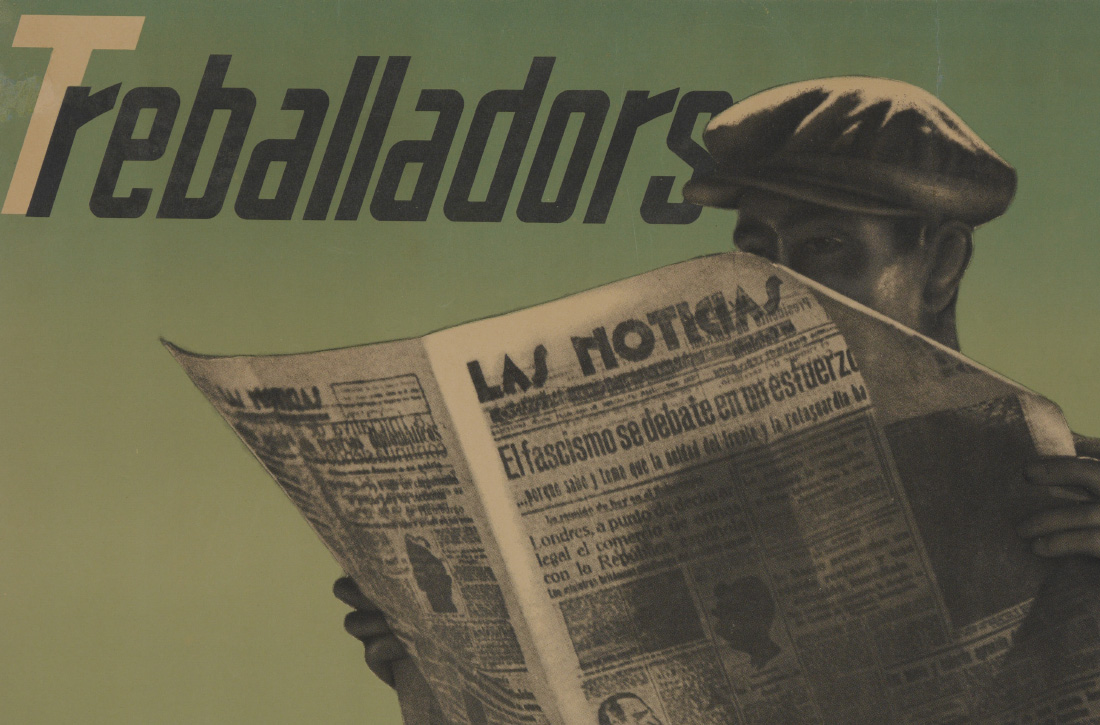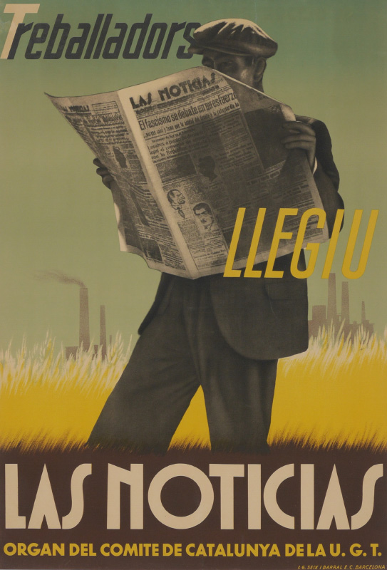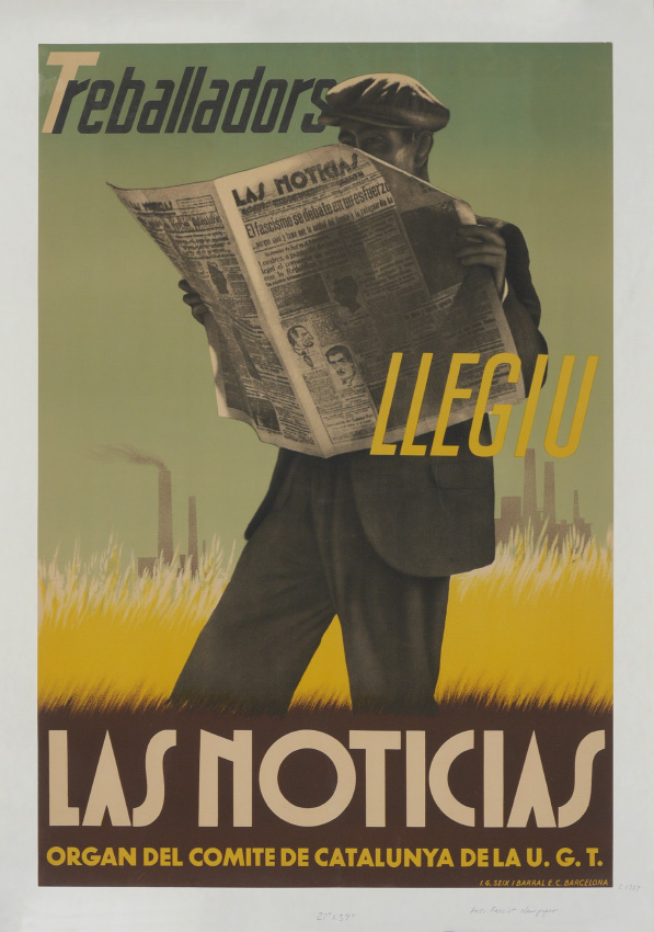 1937 TREBALLADORS LLEGUI LAS NOTICAS POSTER: Anti-Fascist newspaper Spanish Civil War era poster, 38 3/4'' x 26 3/4'', back with linen, 43'' x 30 3/4''.