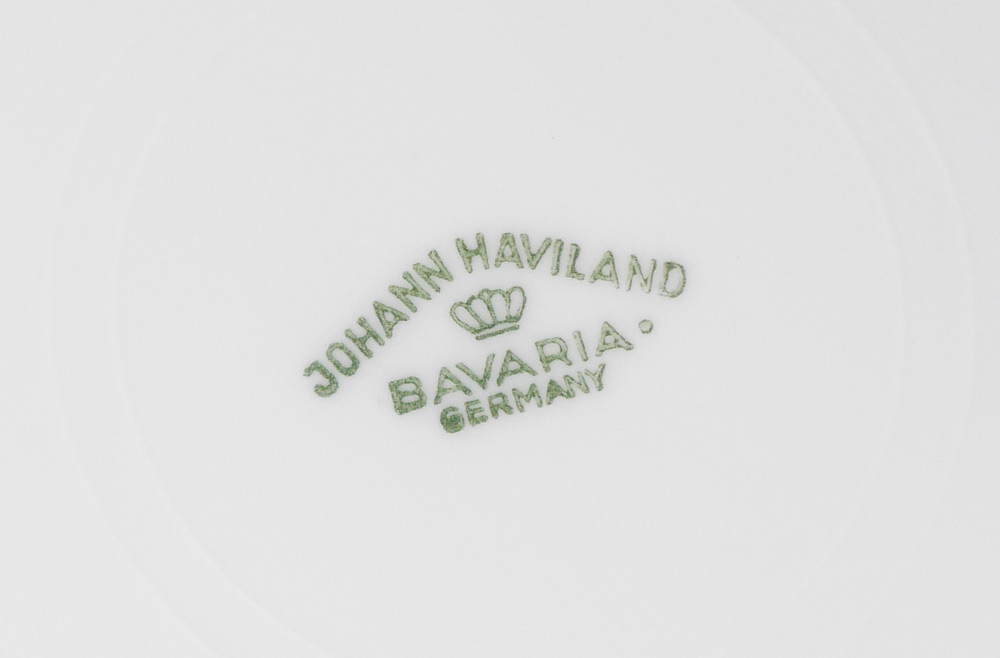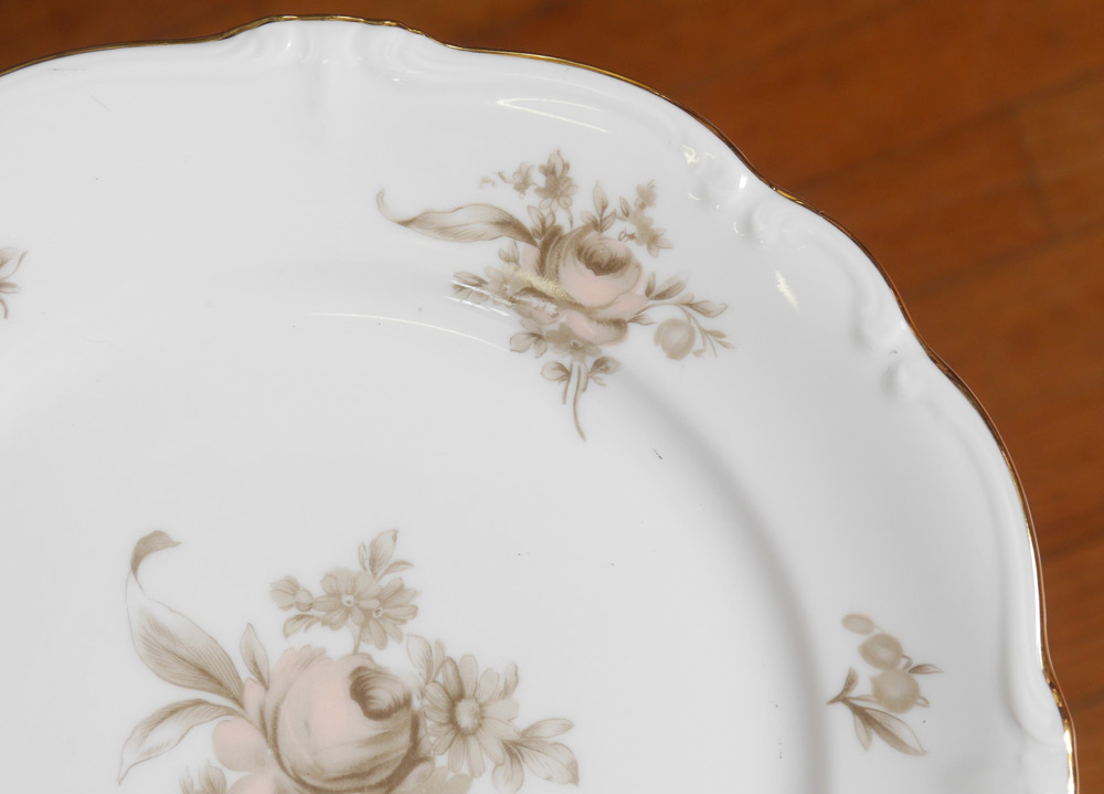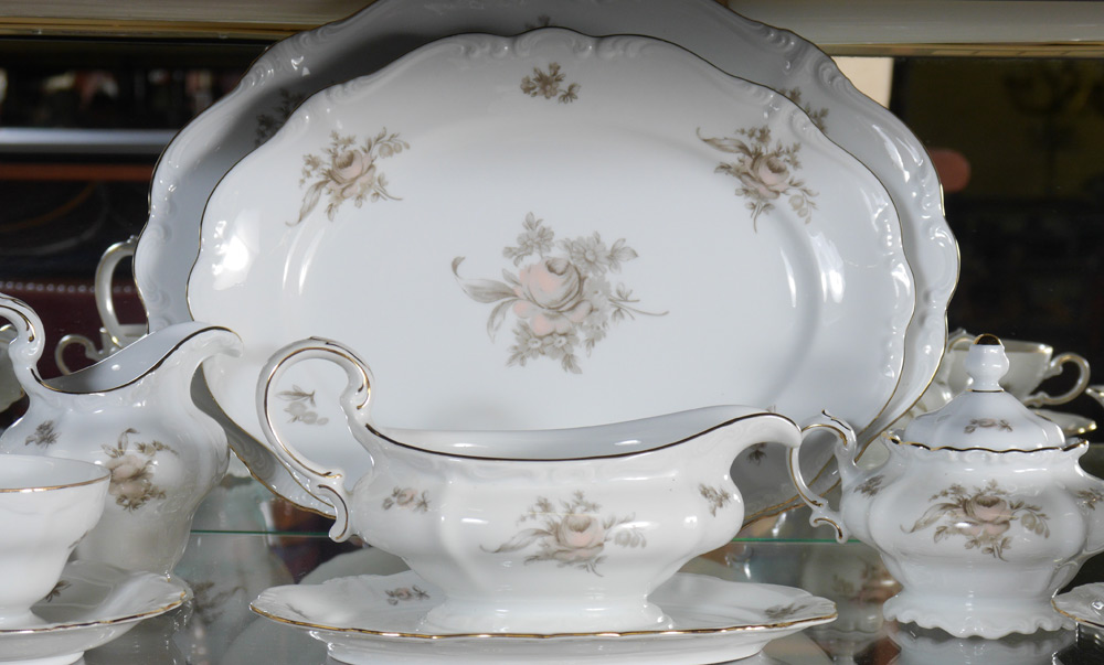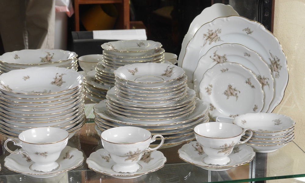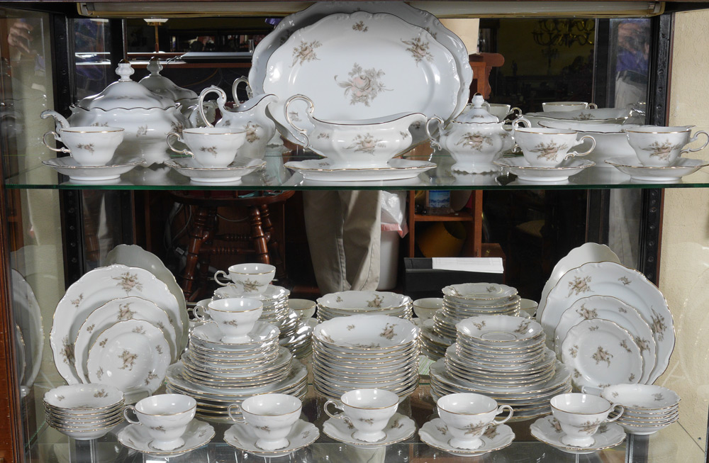 JOHANN HAVILAND FINE BAVARIAN CHINA ''BROWN ROSE'': Approx. 85 pieces to include 12 each of dinner plates (10''), salad plates, bread plates, and soup bowls. Also 11 dessert bowls, 10 cups and 10 saucers, sugar, creamer, open vegetable, covered vegetable, gravy, and 2 platters (13'' and 15'').
