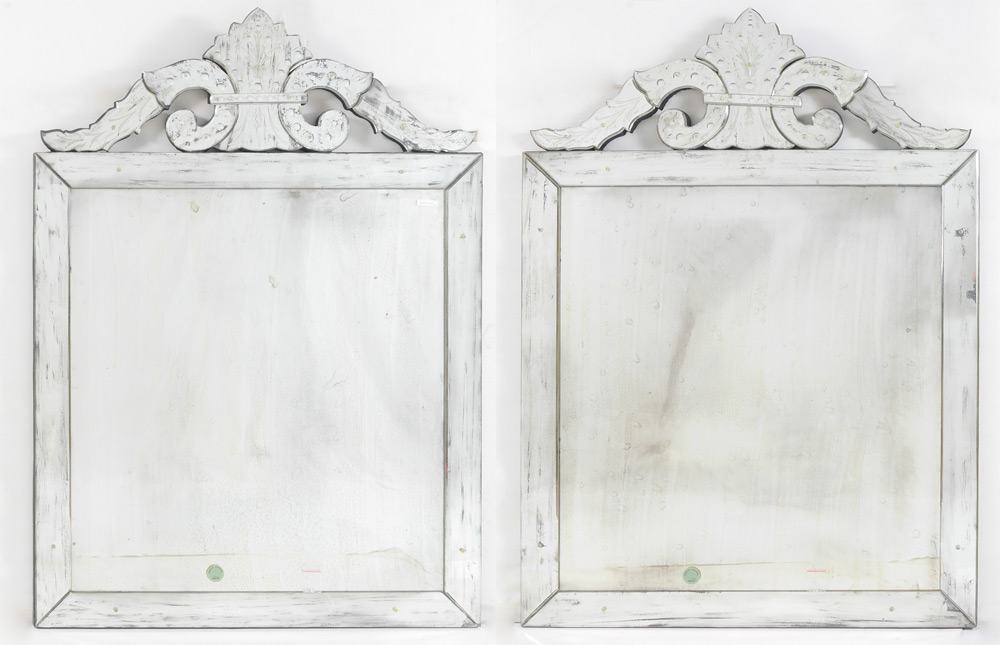 PAIR VENETIAN STYLE MIRRORS: Contemporary mirrors in the antique style. Open work crest over rectangular border, engraved designs and applied rosettes. 54 3/4'' h. x 38 1/2'' x 1''.