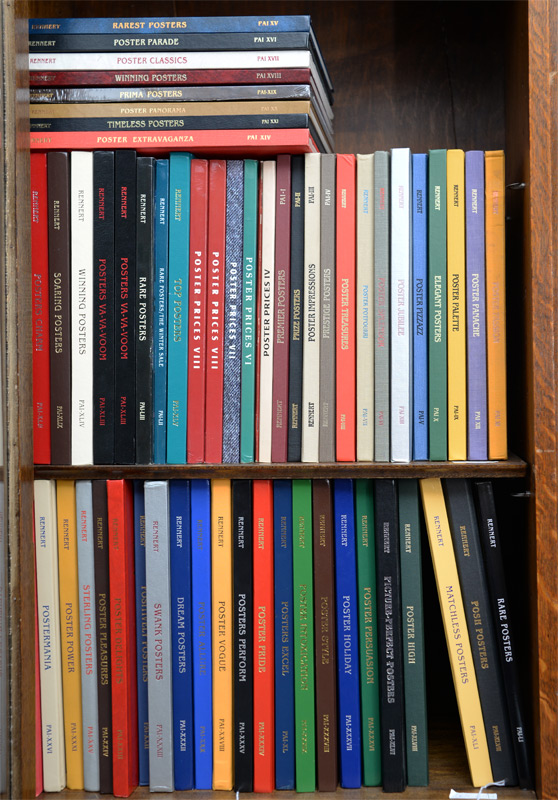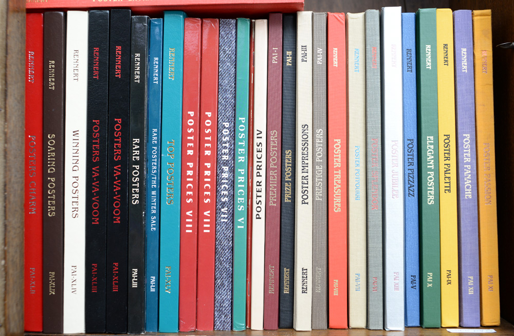 58 VOLUMES RENNART POSTER AUCTION CATALOGS: 58 volumes of Poster Auctions International catalogs plus a few other auction catalogs as well. All appear to be in fine condition, many with prices realized inserts and hand written notations next to lots, exteriors with minor signs of wear. Each volume 12 1/2'' x 9 1/4''.