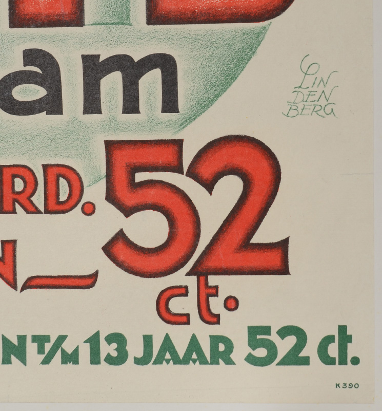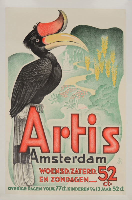 1950'S ARTIS AMSTERDAM ZOO ADVERTISING POSTER: Featuring a Rhinoceros Hornbill bird perched on logo, by Lindenberg, Lithograph. 32'' x 22 3/4'', backed on linen 34 1/2'' x 24''.