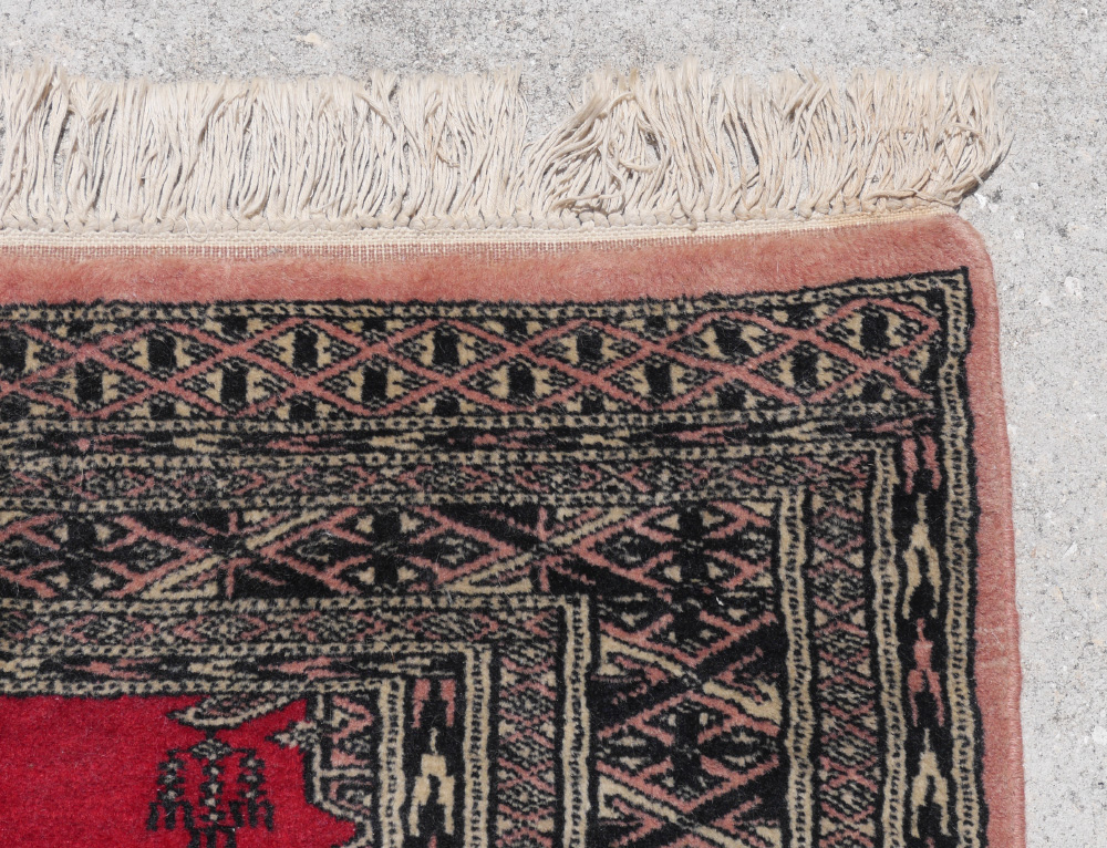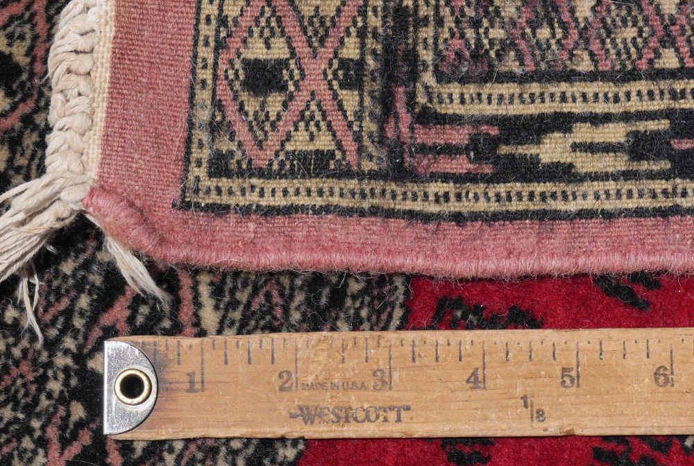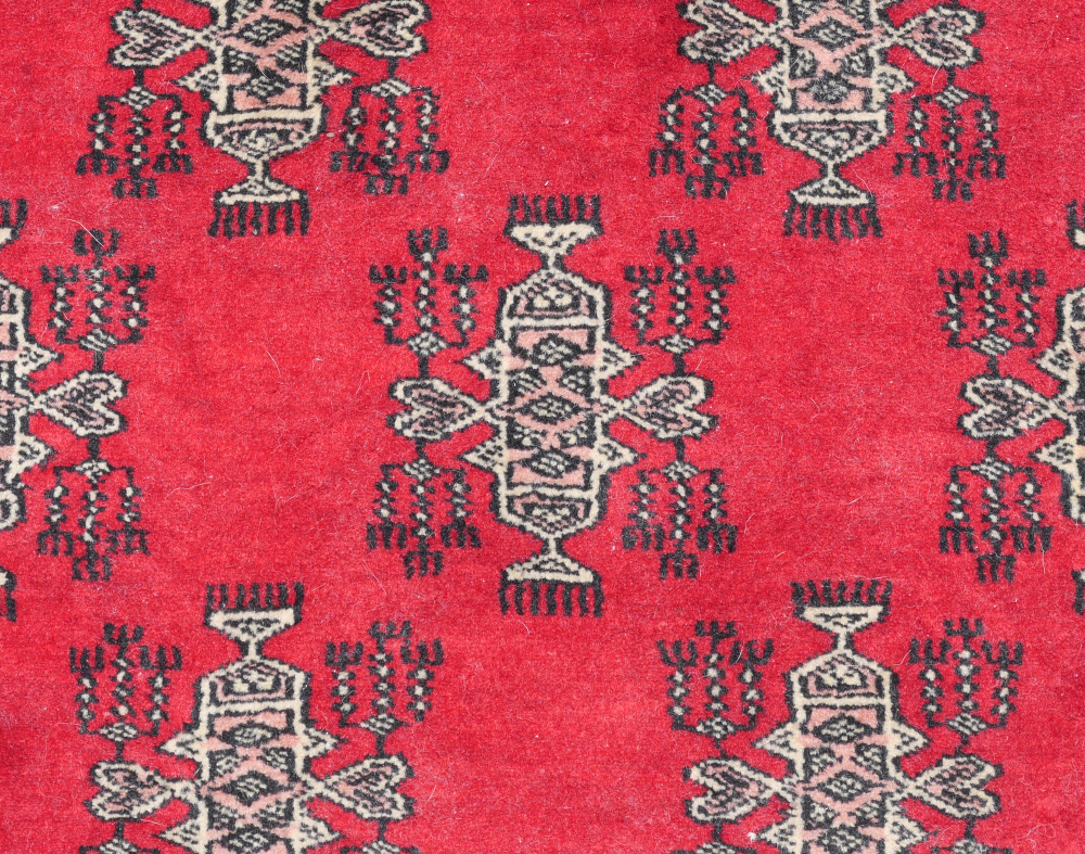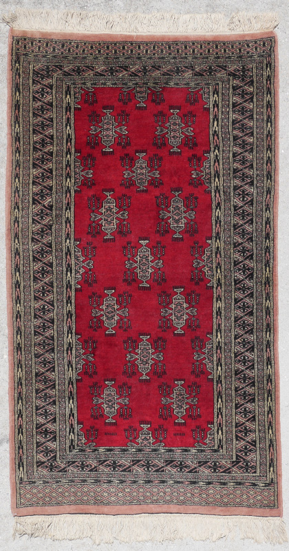 APPROX. 20-35 YR. OLD PAKISTANI-BOKHARA HAND KNOTTED WOOL RUG, 3'1'' x 5'2'': This Bokhara has a bright red field that is covered with staggered rows of the same unusual design ''guls''. The multiple small borders and the ''apron'' at each end are typical and traditional in their make up.