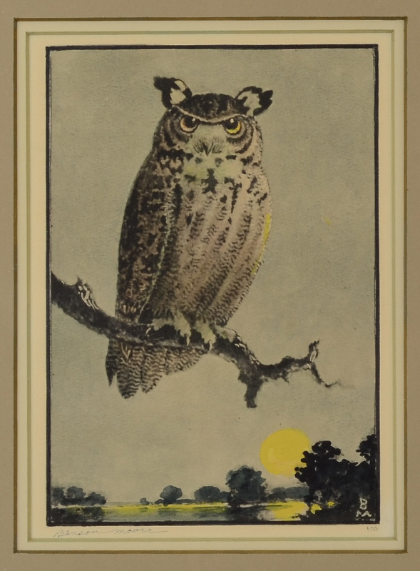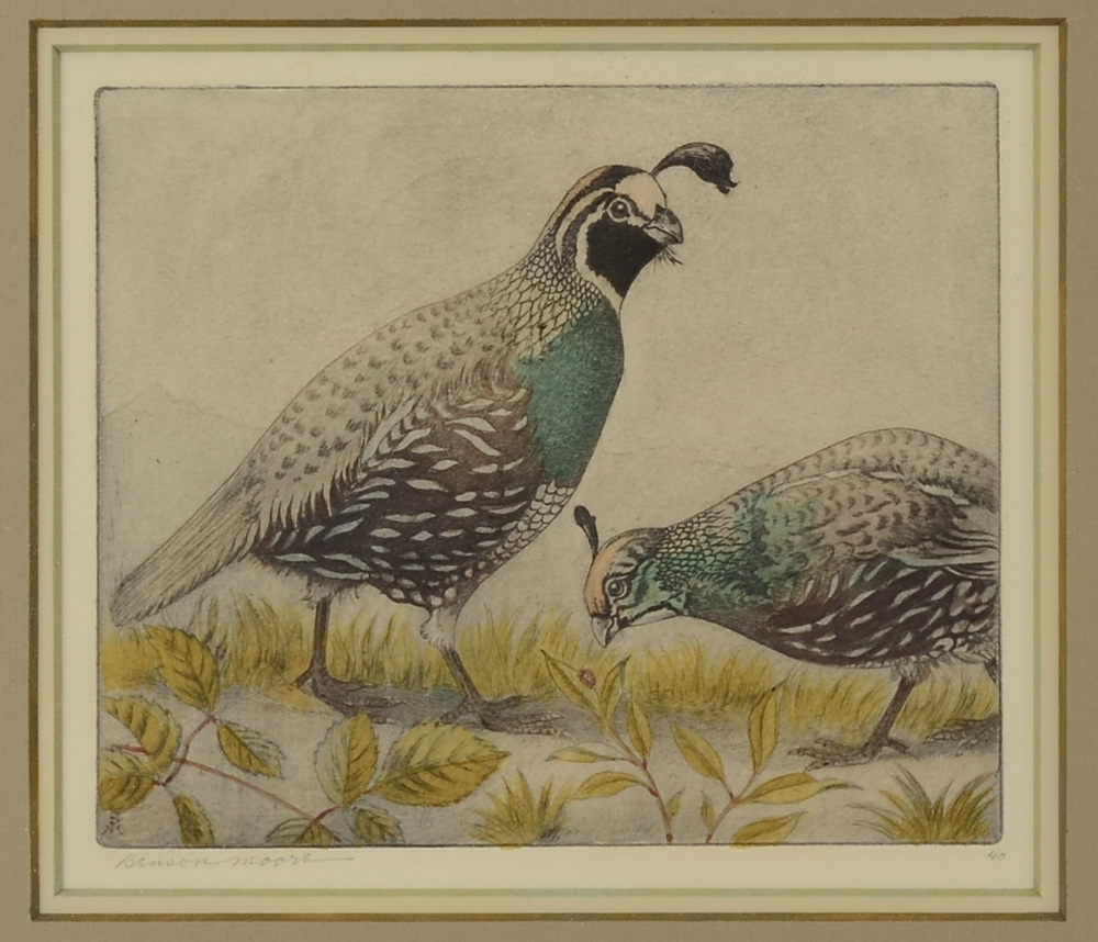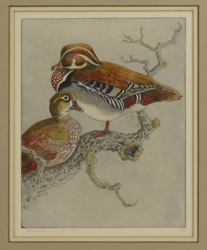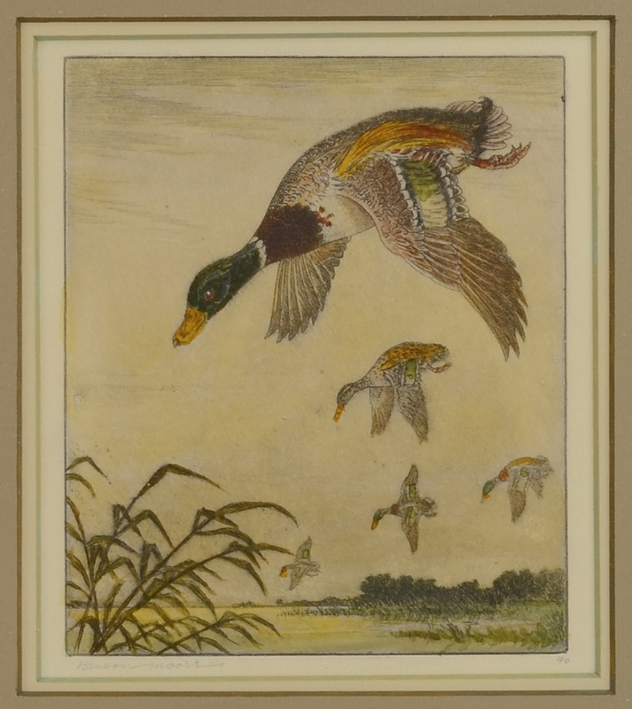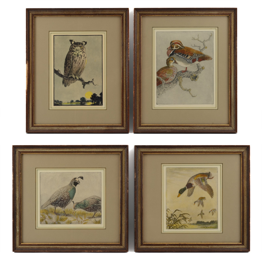 MOORE, Benson Bond, (American, 1882-1974): Game Birds and Owl, 3 Color Etchings and 1 Color Offset Lithograph to include 1) Mallards in Flight, Color Etching, 7 1/2'' x 6 1/2'', pencil signed lower left, numbered 40 lower right, custom frame, 12'' x 13''; 2) Male and Female Quails, Color Etching, sight size 6 1/2'' x 7 1/2'', pencil signed lower left, numbered 40 lower right, custom frame, 12'' x 13''; 3) Male and Female Wood Ducks, Color Etching, sight size 9 1/2'' x 7 1/2'', pencil signed lower left, numbered 40 lower right, custom frame, 15'' x 12 1/2''; 4) Owl Perched on a Branch, Offset Lithograph, sight size 9'' x 6 1/2'', signed in pen lower left, numbered 100 lower right, custom frame, 15'' x 12 1/2''.