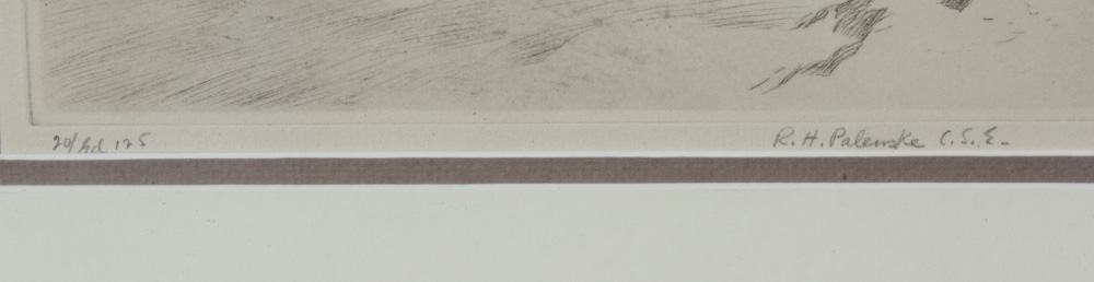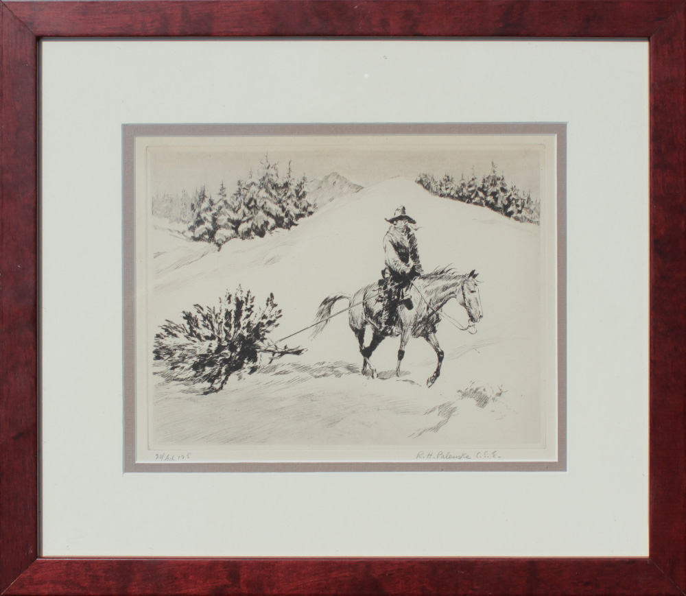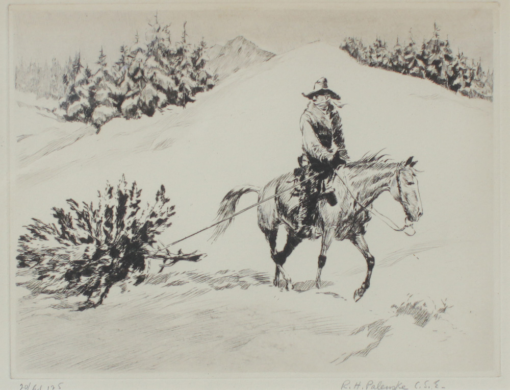PALENSKE, Reinhold H. (American, 1884-1954): Bringing Home the Christmas Tree A Cowboy on Horseback Dragging a Fresh Cut Tree Through the Snow, Etching, sight size 6 1/4'' x 8 1/4'', pencil signed lower right, numbered 20 of 25 lower left, fine custom frame, 11 3/4'' x 13 3/4''.
