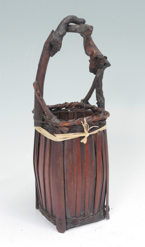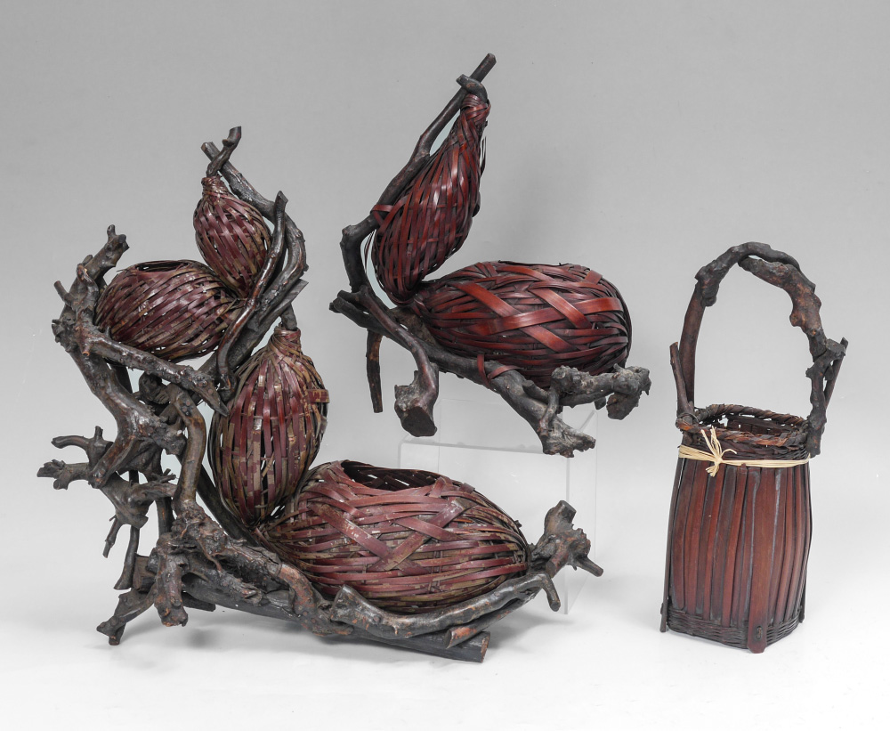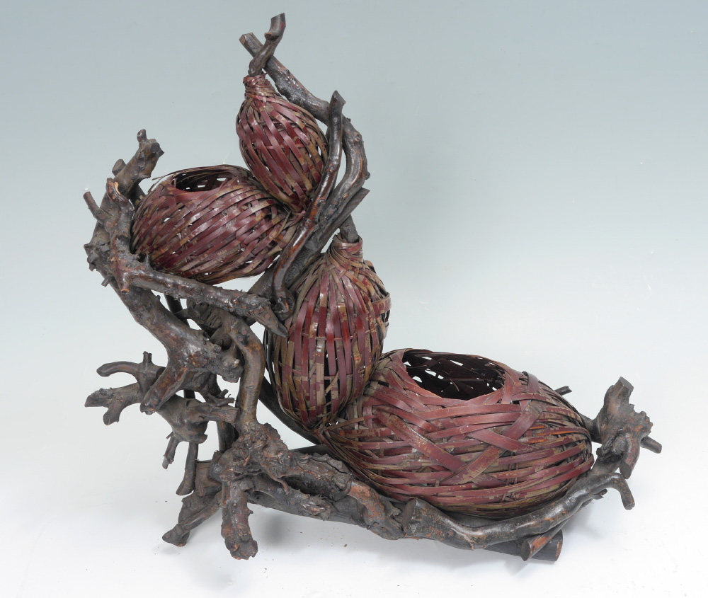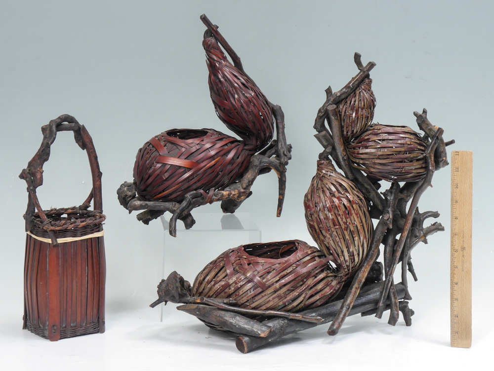 3 MEIJI JAPANESE WOVEN BAMBOO IKEBANA BASKETS: 3 pieces total woven bamboo and tree root construction to include 1) Exceptionally large with 4 woven gourds, overall 18'' h. x 18'' x 11''. 2) 2 gourds, overall 14'' h. x 12'' x 8 1/4''. 3) Squared basket with handle, 14'' h. x 6''.