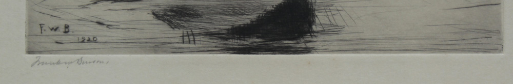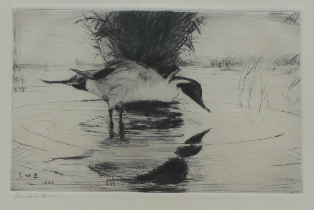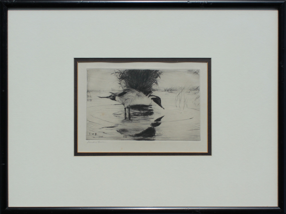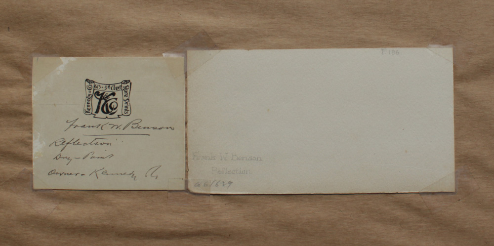 BENSON, Frank Weston, (American, 1862-1951): ''Reflection'', Drypoint Etching, sight size 6 1/2'' x 9'', 9'' x 12'' with margins, pencil signed lower left, original Kennedy label affixed verso, black frame, 15'' x 19 3/4''.