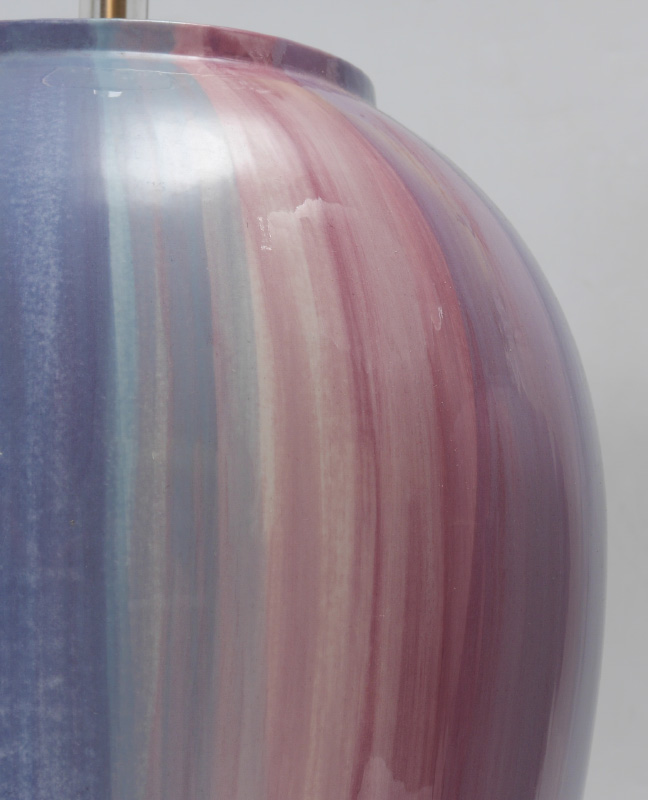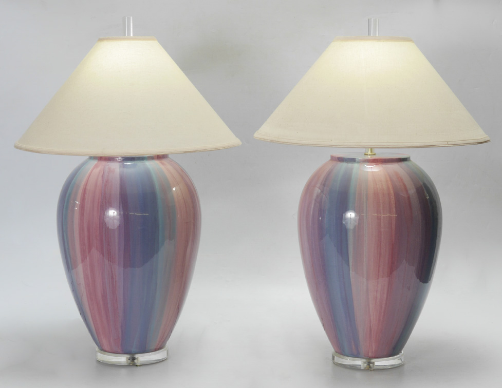 PAIR 1970'S POTTERY AND LUCITE LAMPS: Lucite base, pottery bodies with striped variegated soft pastels, Lucite ring under single socket fixture, Lucite finial. 32 3/4'' h. x 13 1/2'', sold with 2 cloth shades, 9 3/4'' x 21 1/4''.