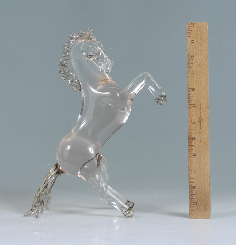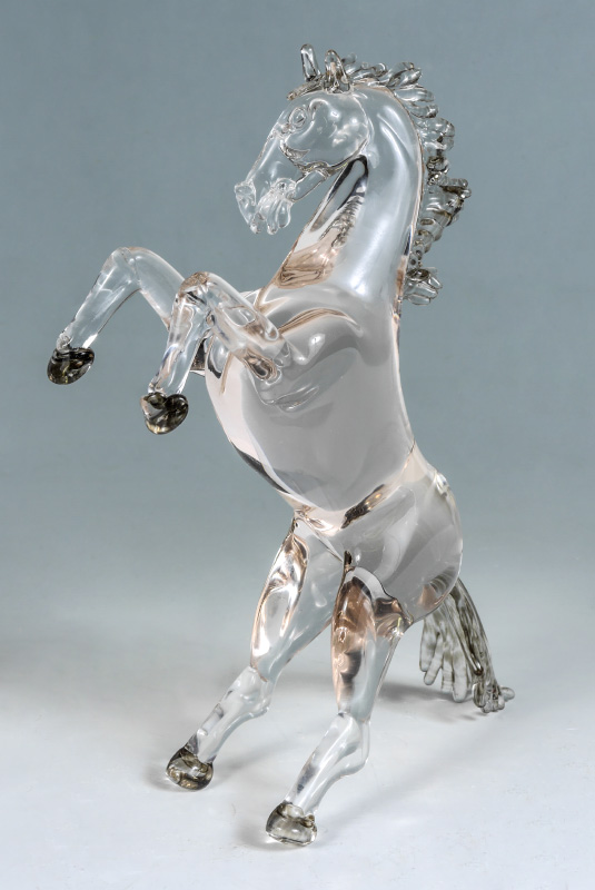 REARING CRYSTAL HORSE: Illegibly signed on stomach, crystal body with pink tinge, overall measures 11 3/4'' h. x 9'' x 3 1/2''.