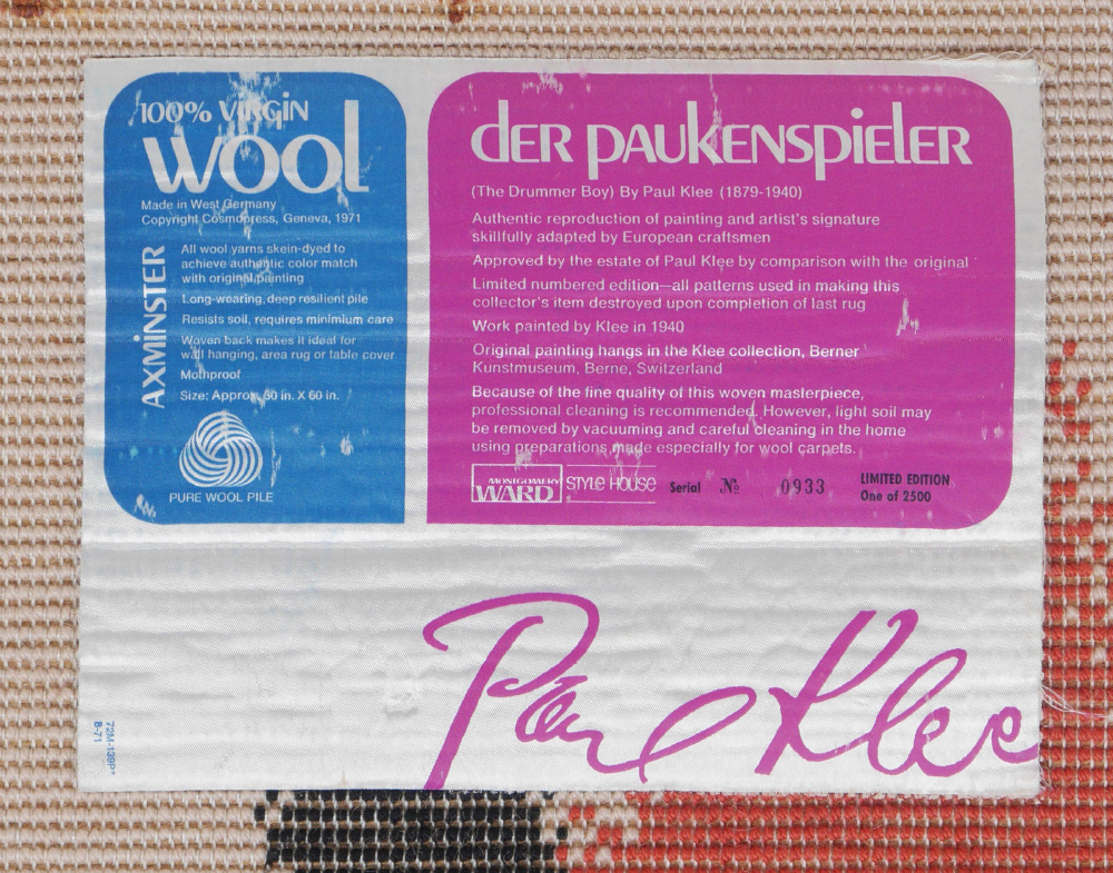 KLEE, Paul, (Swiss, 1879-1940): ''Little Drummer Boy'', Tapestry, limited edition manufactured by Montgomery Ward, Number 933 of 2500, labels affixed verso, approximately 55'' x 29'', comes with custom hanging board.
