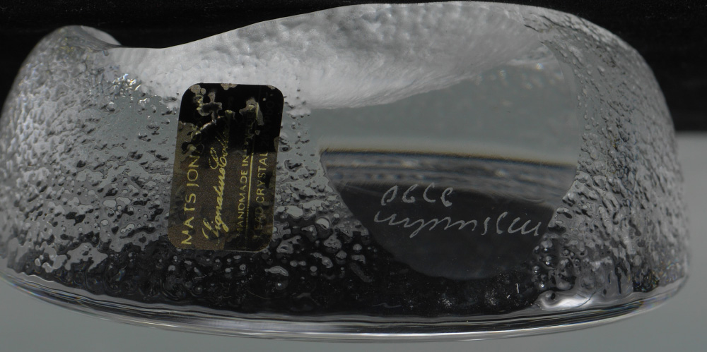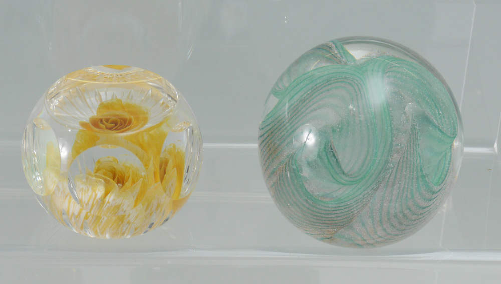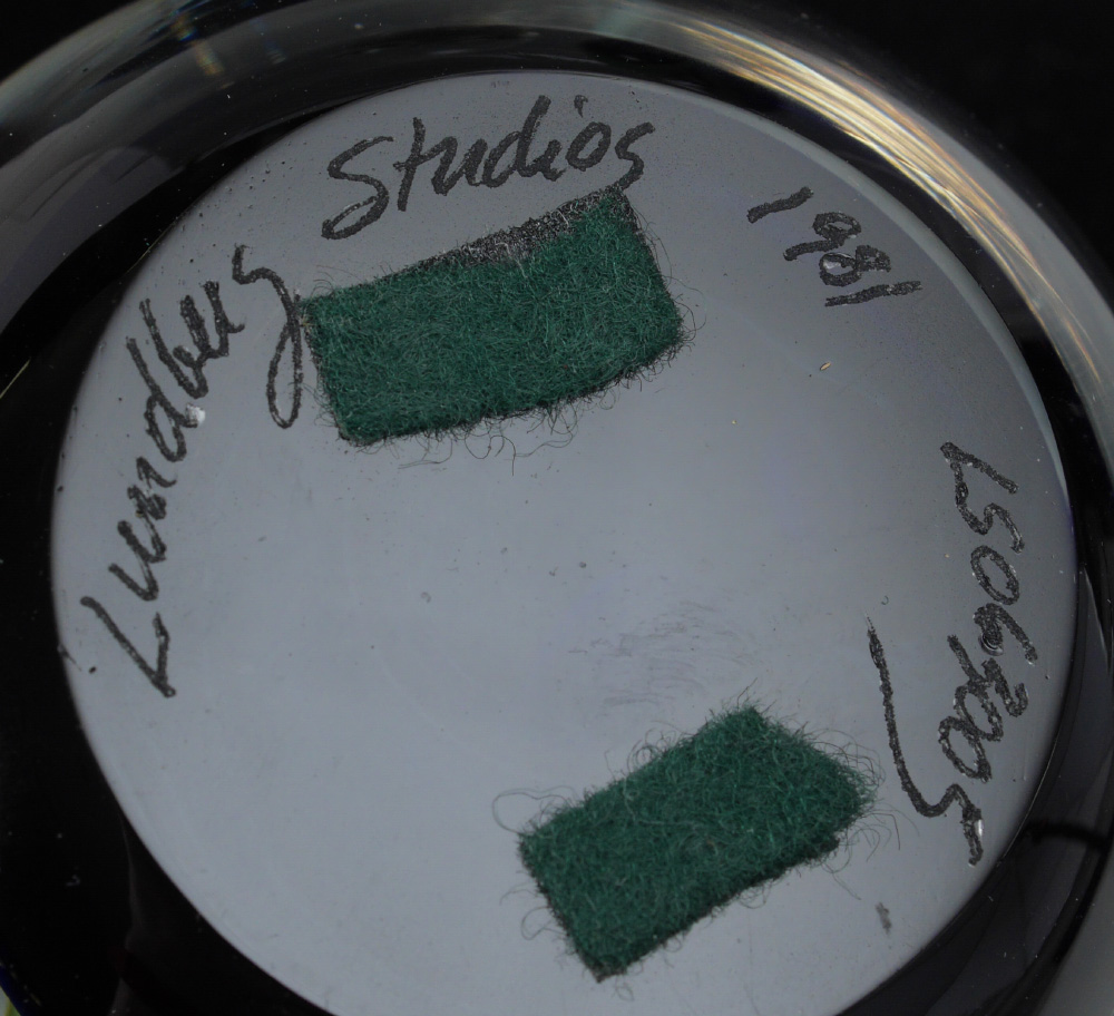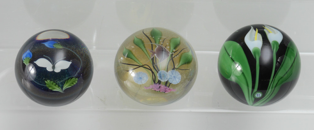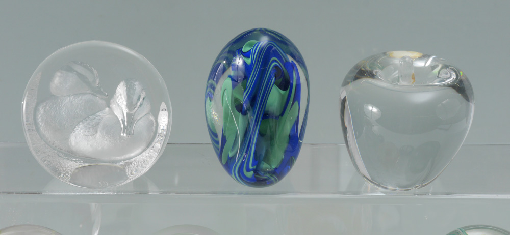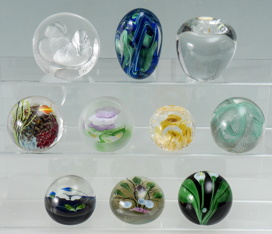10 PIECE ART GLASS PAPERWEIGHT COLLECTION: 10 pieces total to include 1) Caithness frosted with floral interior, 3 1/2''. 2) Mats Jonasson Carved ducklings, 3 3/4''. 3) N. Sudek free form, 4 1/4'' h. 4) Lundberg Studios underwater scene with fish, 3''. 5) Lunderberg Studios flowers and butterfly, 2 3/4''. 6) Orient & Flume Lilies, 2 3/4''. 7) Cape Cod Glass Works, rose interior, 2 1/2''. 8) Nourot ribbon swirl, 2 3/4''. 9) Richard Satava underwater coral reef with fish, 3''. 10) Val St. Lambert crystal apple, 3 1/2''.
