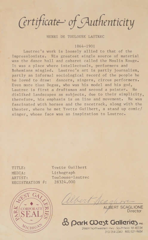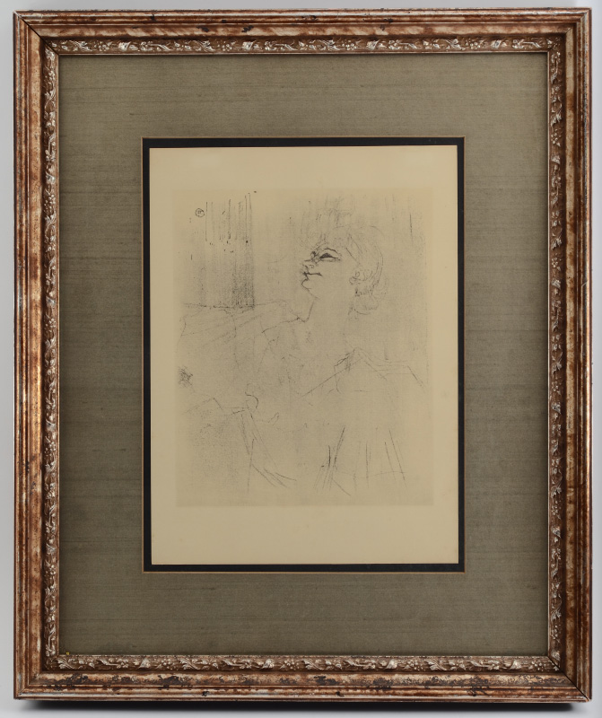 PARK WEST TOULOUSE-LAUTREC LITHOGRAPH ''YVETTE GUILBERT'': Sight size 15'' x 10 3/4'', label affixed verso, framed, 24'' x 20 1/2''.