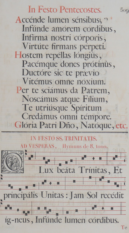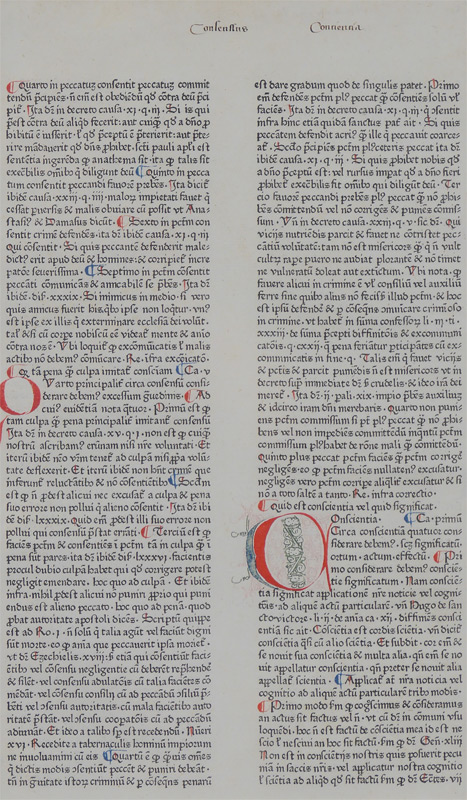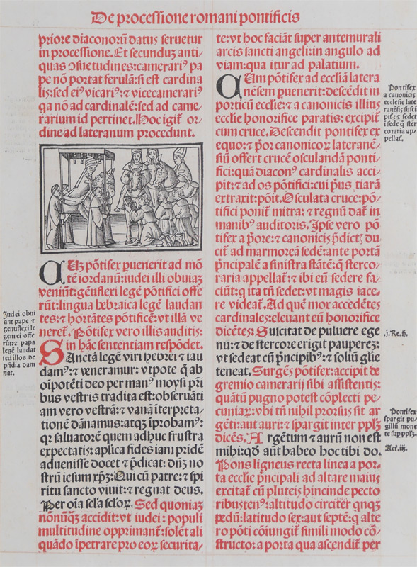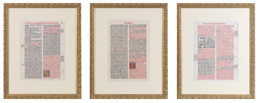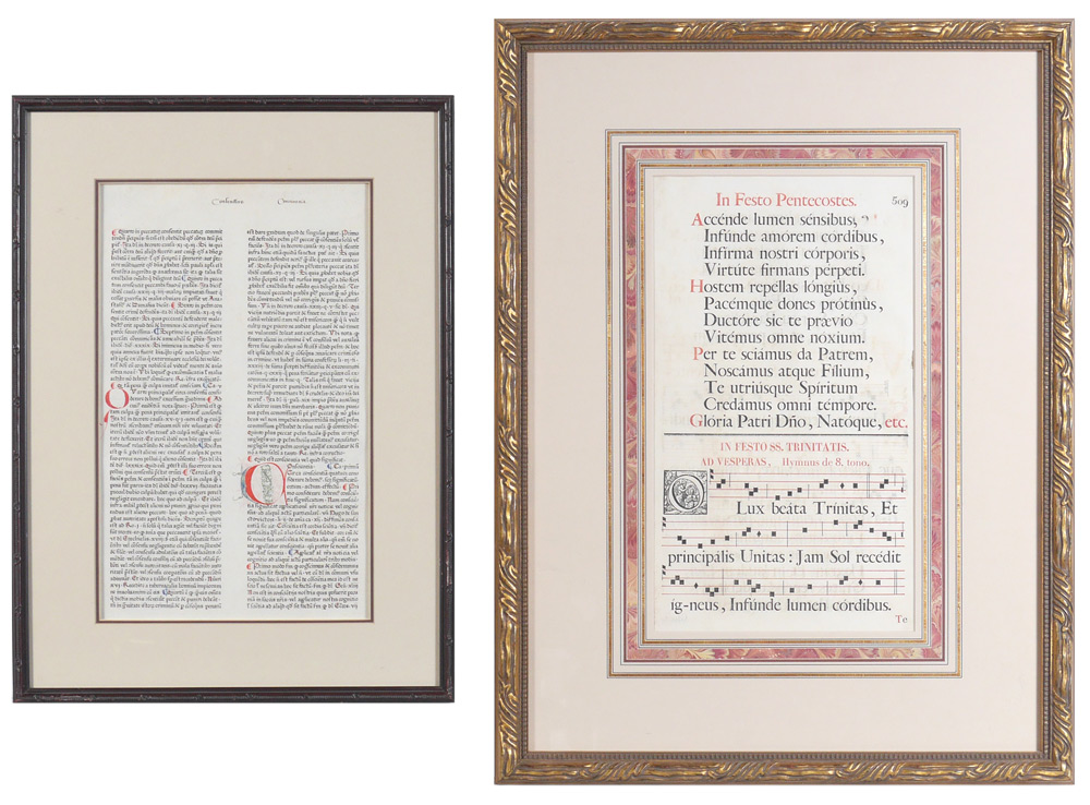 5 PIECE FRAMED ILLUMINATED BOOK PAGES: An assembled collection to include 1-3) Framed pages from the Pontificale Romanum, circa 1520 Venice, with assorted illuminated letters, black and red block text, engravings. Each page sight size 11 1/2'' x 8 1/2'', framed (one double sided) 18 1/2'' x 15''. 4) Unknown text, sight size 14 7/8'' x 9'', double sided frame 20 3/4'' x 15''. 5) Antiphonal music sheet, unknown text, sight size 15 3/4'' x 9'', framed 26 1/2'' x 20''.