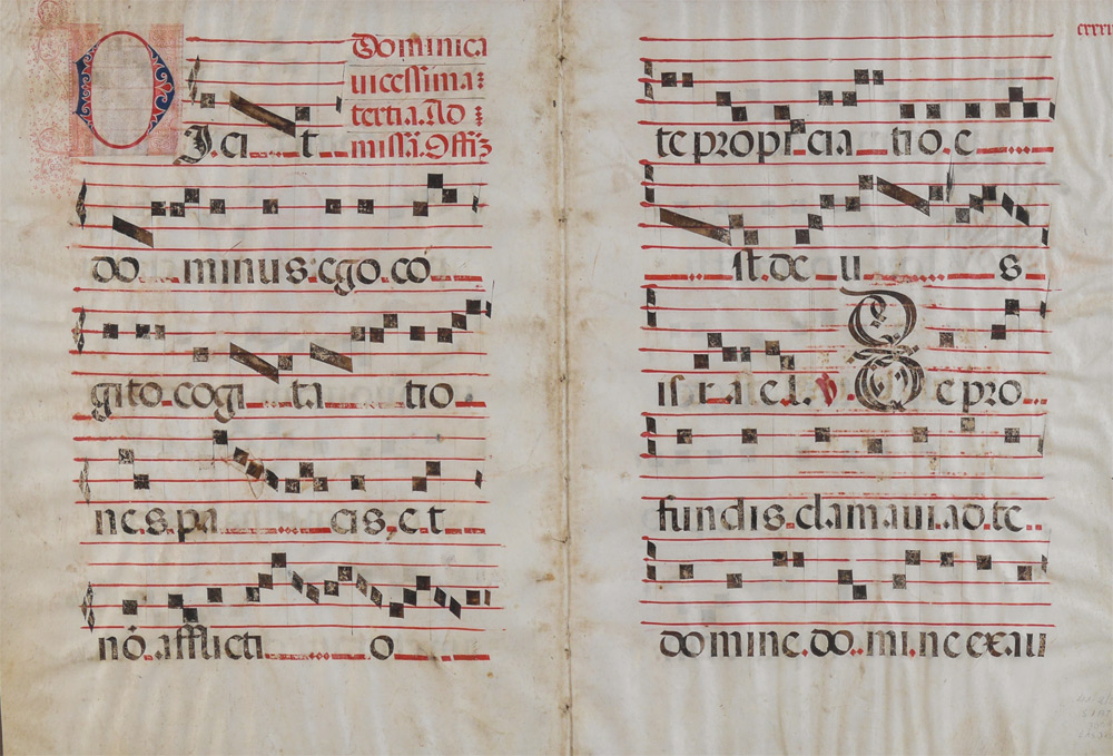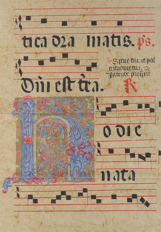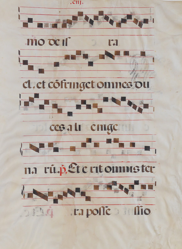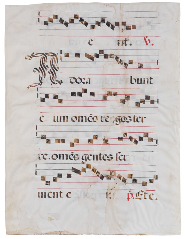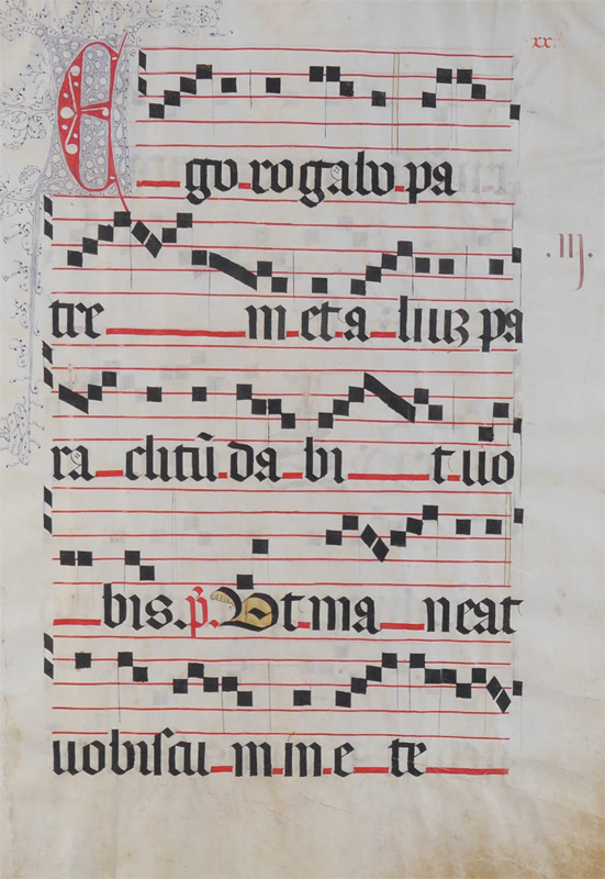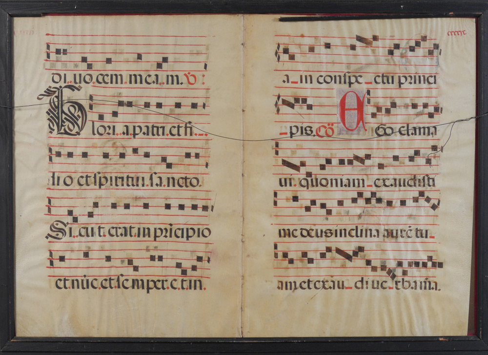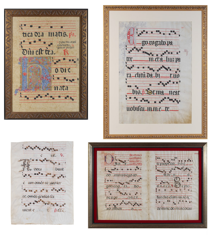 COLLECTION OF ANTIPHONAL MUSIC SHEETS ON VELLUM: An assembled collection of various time periods, 1) With large illuminated ''H'', sight size 27'' x 19 1/4'', framed 31 3/4'' x 24''. 2) 2 pages double sided, pencil writing lower corner, sight size 20 1/4'' x 29 1/4'', framed 25'' x 34''. 3) Largest of the group with illuminated ''G'', sight size 29 1/2'' x 21'', framed 39 1/4'' x 30 1/2''. 4) Unframed double sided, 24'' x 18''.