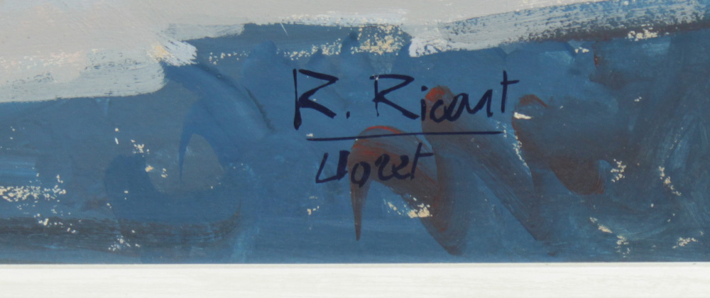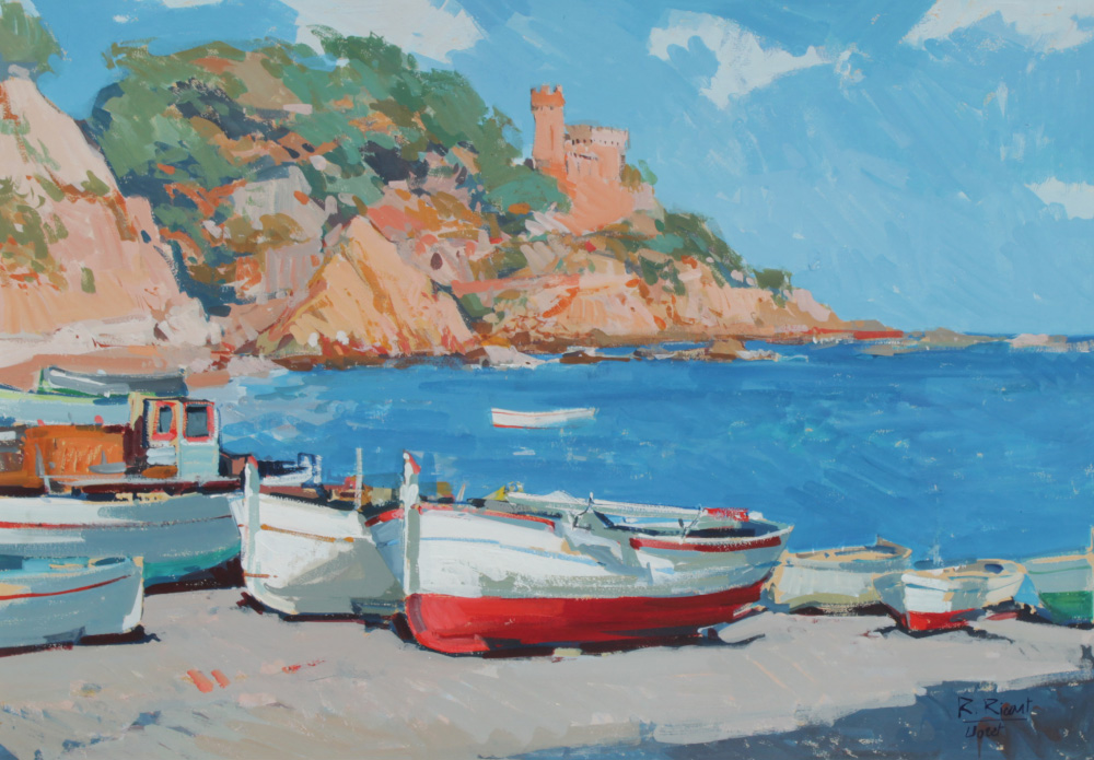 RICART, Robert, (French, 20th Century): Mediterranean Shore with Fishing Boats and Castle in the Distance, Oil/Board, sight size 28'' x 39 1/2'', signed lower right and titled illegibly, framed, 35 1/2'' x 47''.