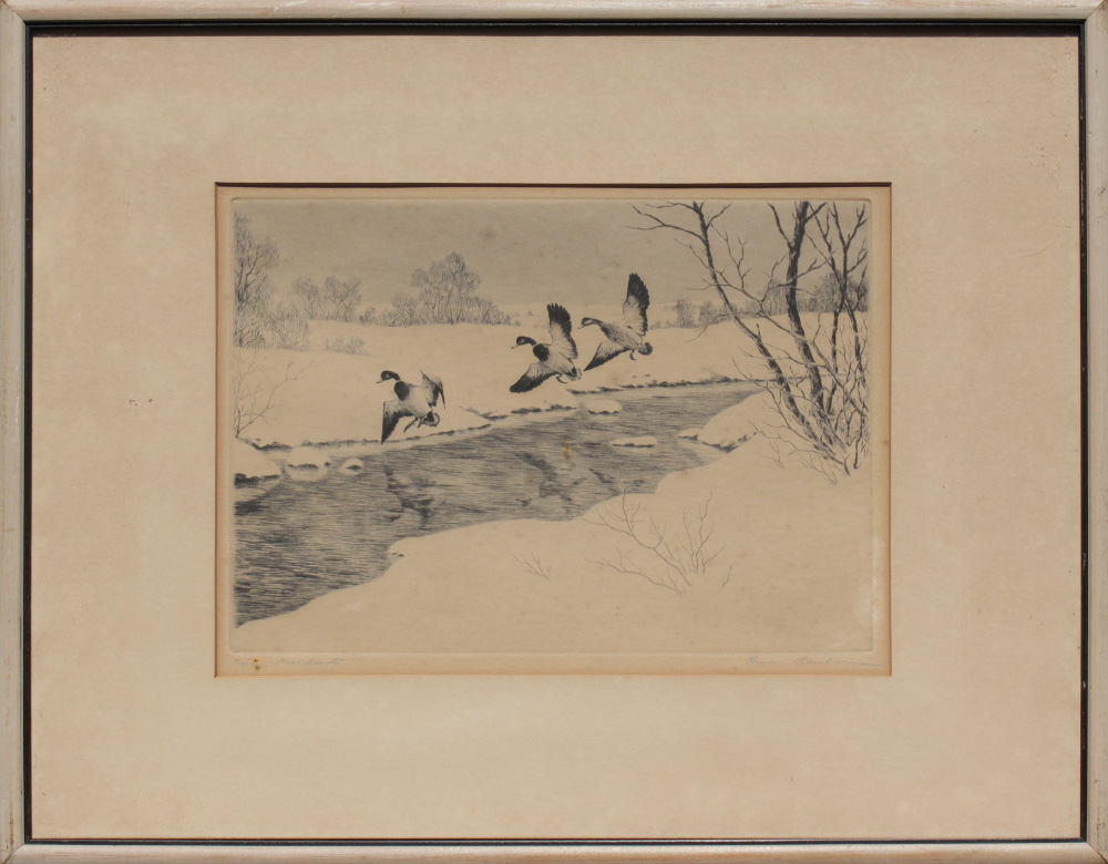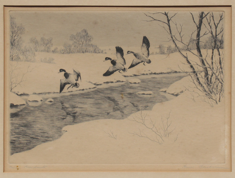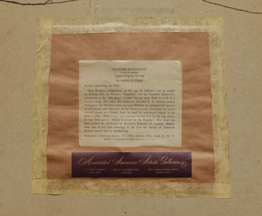 KLEIBER, Hans, (American, 1887-1967): ''Winter Residents'', Etching, sight size 8'' x 11 1/4'', pencil signed lower right, titled lower left, AAA label affixed verso, framed, 14 3/4'' x 19''.