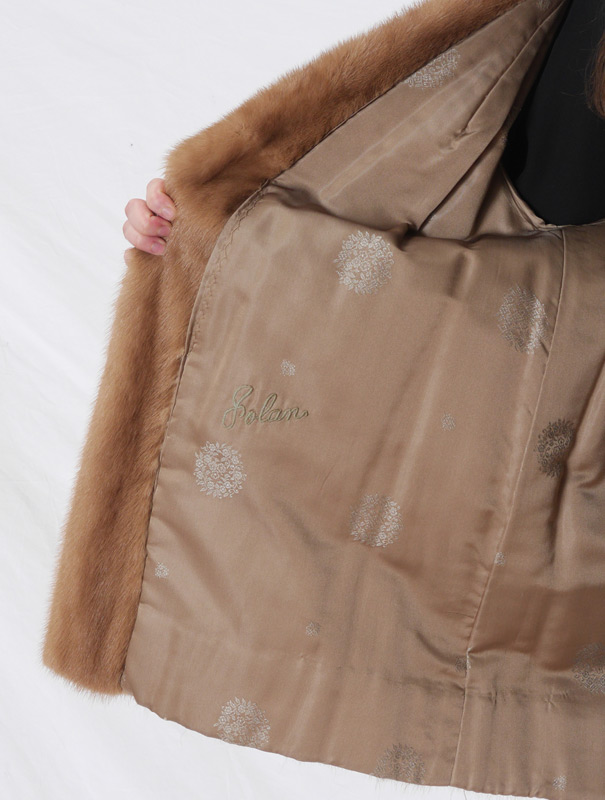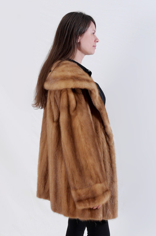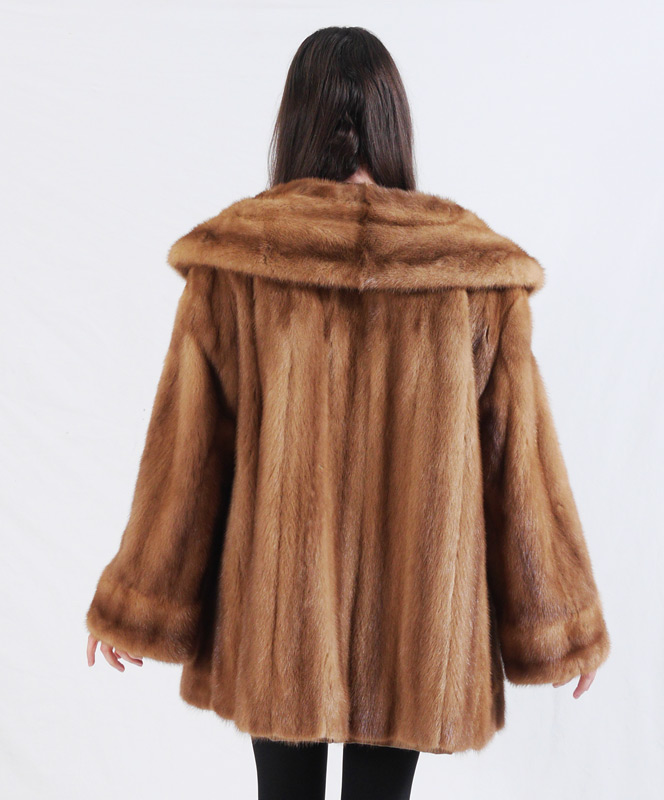 CARAMEL MINK FUR SWING COAT: Caramel color swing length coat with generous collar and bell sleeves. Maintained in cold storage. Medium to large size measures approx. 32'' collar to hem, 18'' shoulder to shoulder, and 25'' shoulder to cuff. Dazenko & Son Furrier Bridgeport Ct. label.