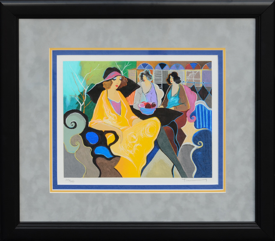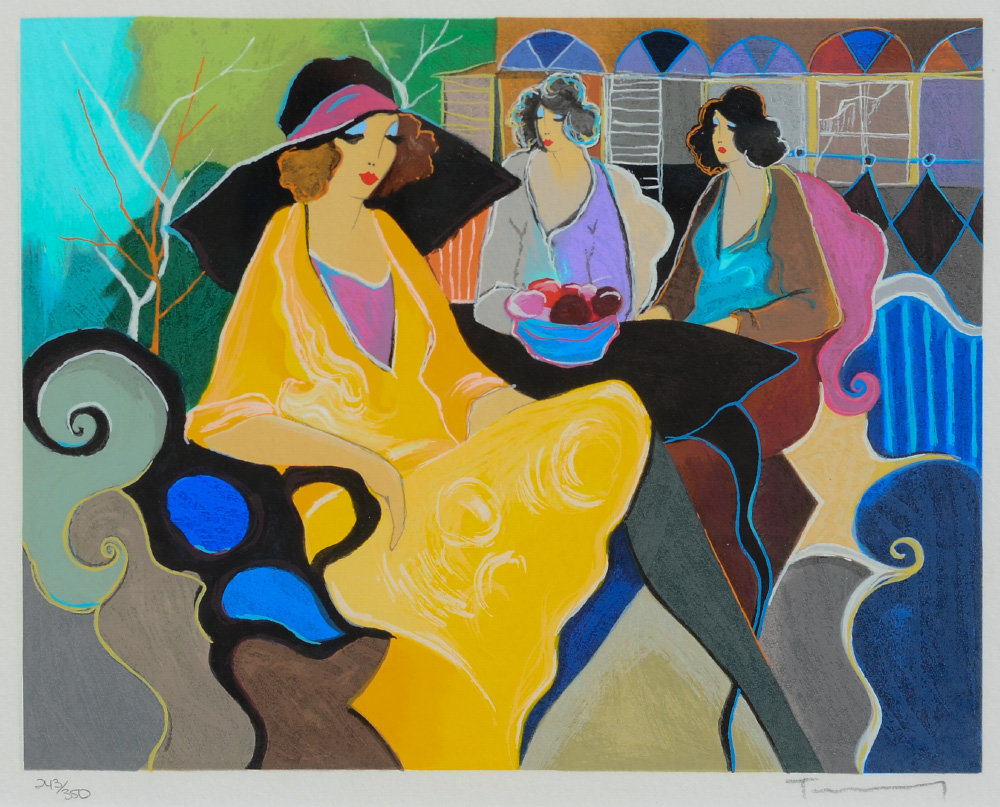 TARKAY, Itzchak, (Israeli, 1935- ): Ladies at a Cafe, Embossed Serigraph, sight size 9 1/2'' x 11 1/2'', pencil signed lower right, numbered 243 of 350 lower left, custom black frame, 18'' x 20''.