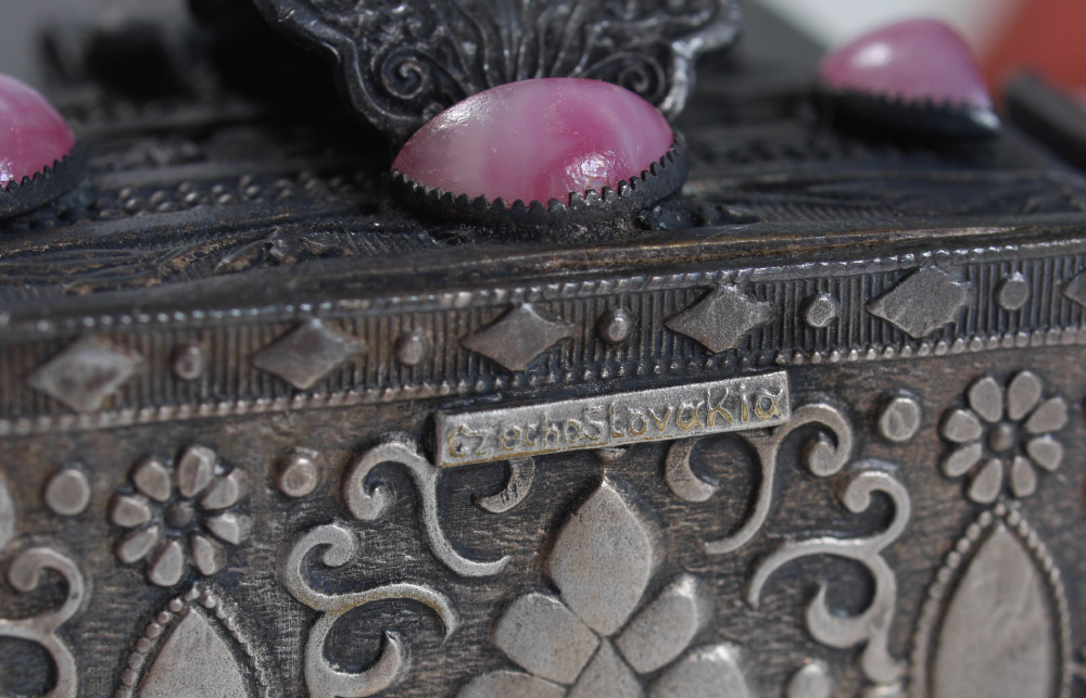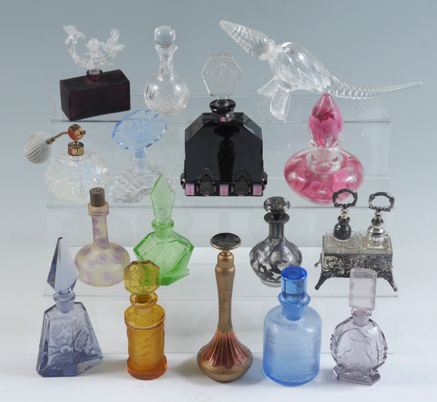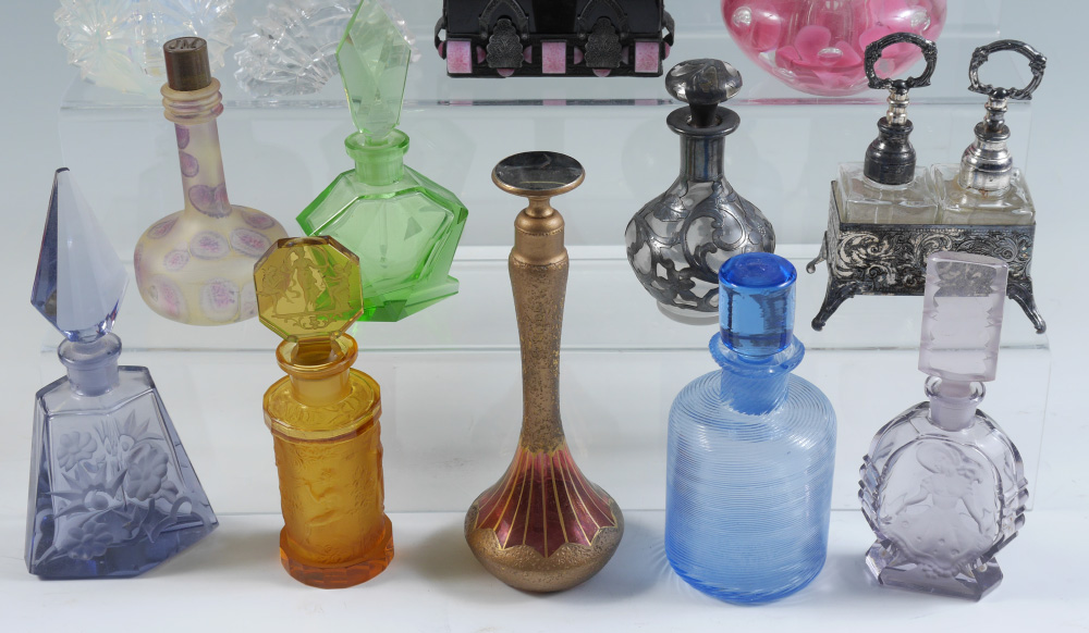 OUTSTANDING PERFUME BOTTLE COLLECTION: Featuring a De Vilbiss cranberry glass, 6 3/4'' tall; also to include, black Czech bottle with metal mounts, pink cabochons and a clear stopper; Joe St. Clair pink paperweight bottle, Israeli art glass, colored Czech bottles, and silver overlay. The tallest is the De Vilbiss, the smallest is the cut glass, 4 1/4'' tall.