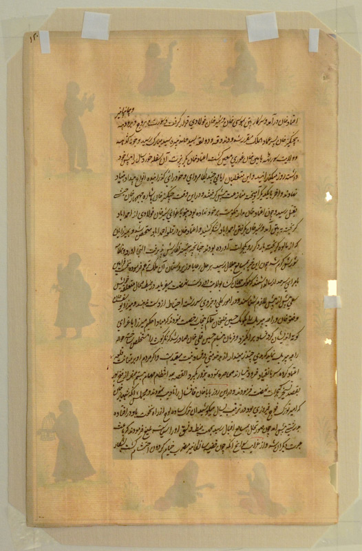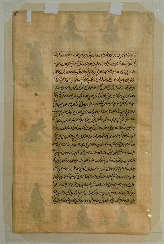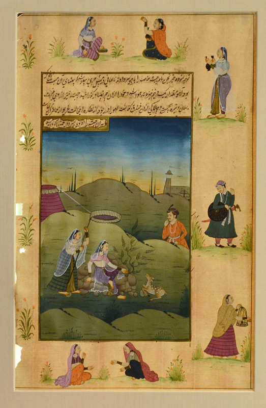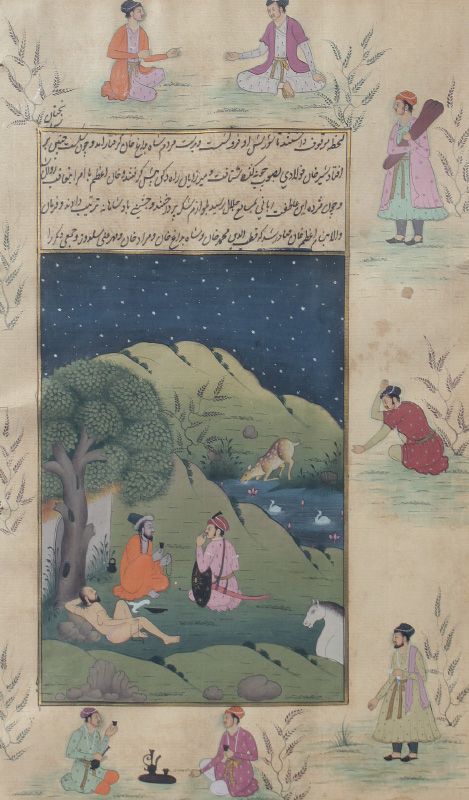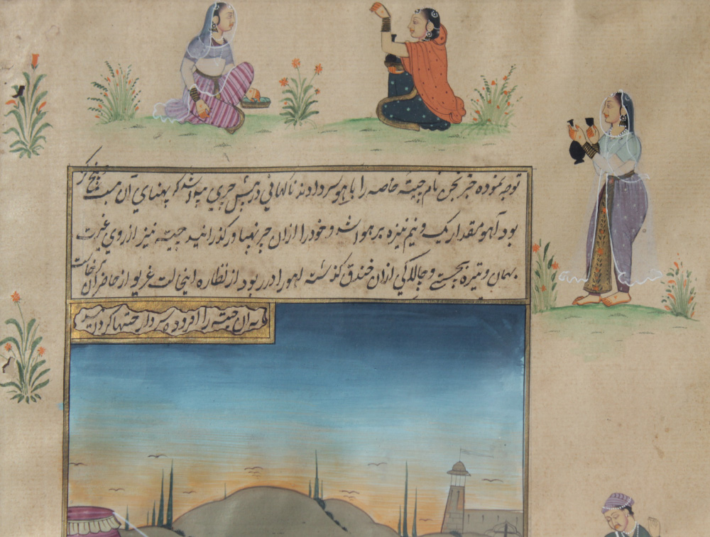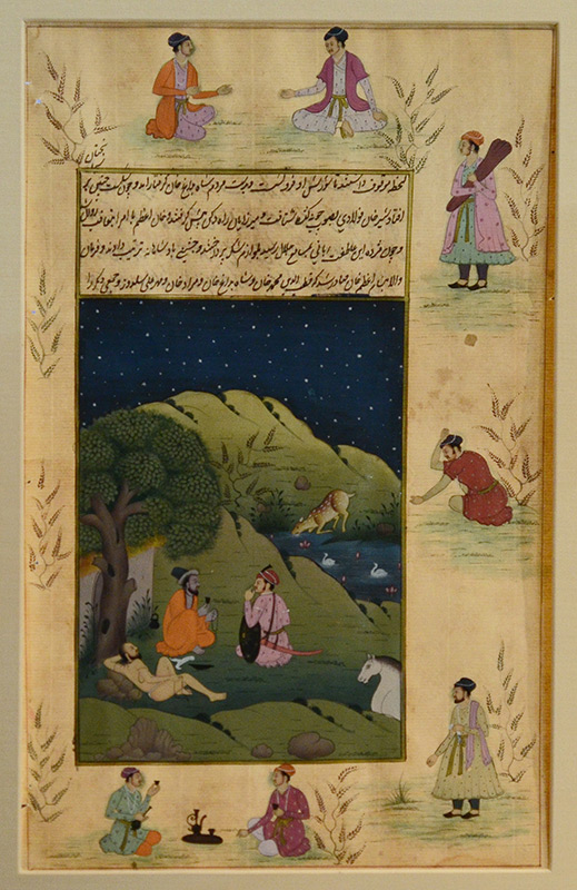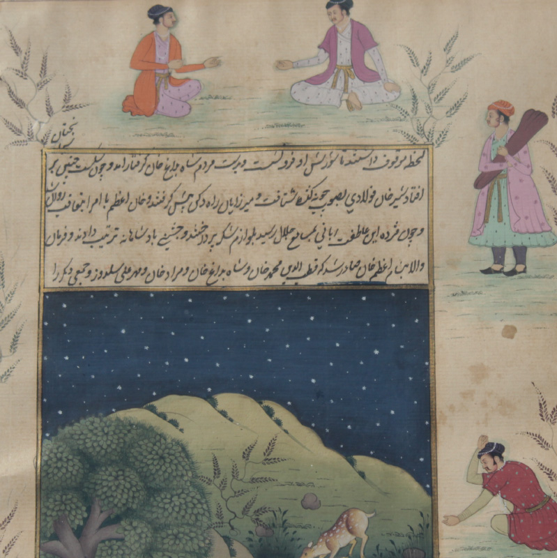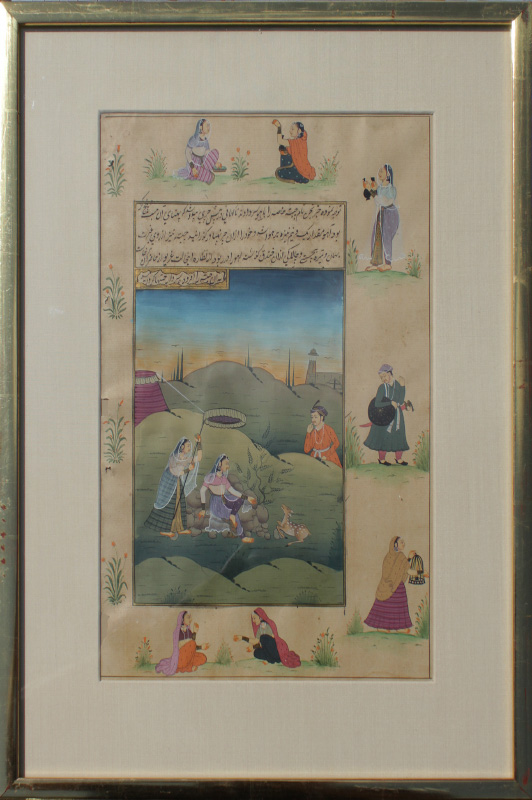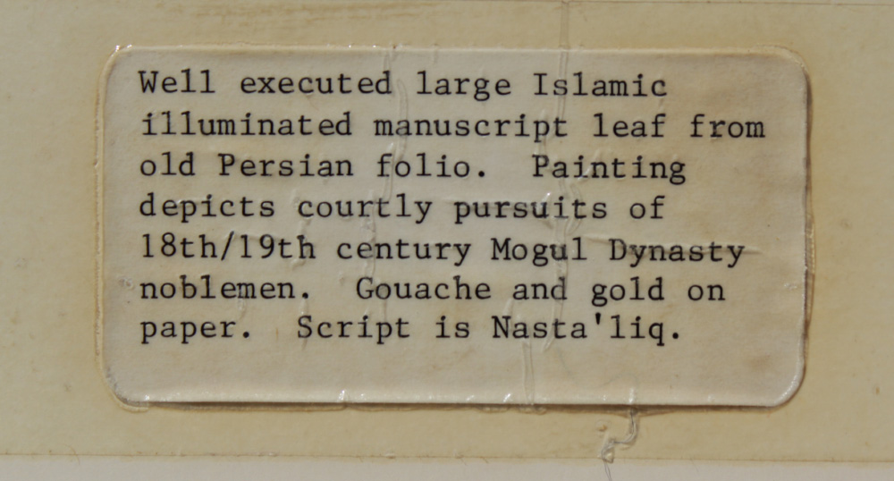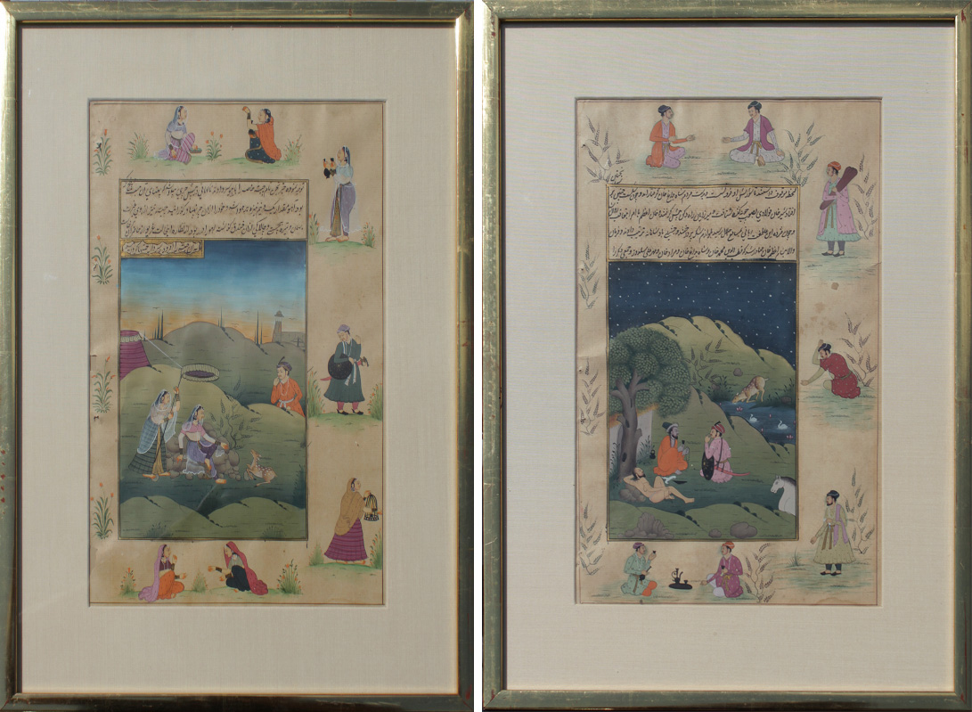 2 EXCELLENT ISLAMIC ILLUMINATED MANUSCRIPT PAINTINGS: Illuminated Manuscript Paintings, Gouache/Gold/Paper, sight size of each is approximately 12 3/4'' x 8'', back label of one reads ''Well executed large Islamic illuminated manuscript leaf from old Persian folio depicting courtly pursuits of 18th and 19th Century Mughal Dynasty nobelmen.'', matching frames, 18 1/4'' x 13 1/4''.