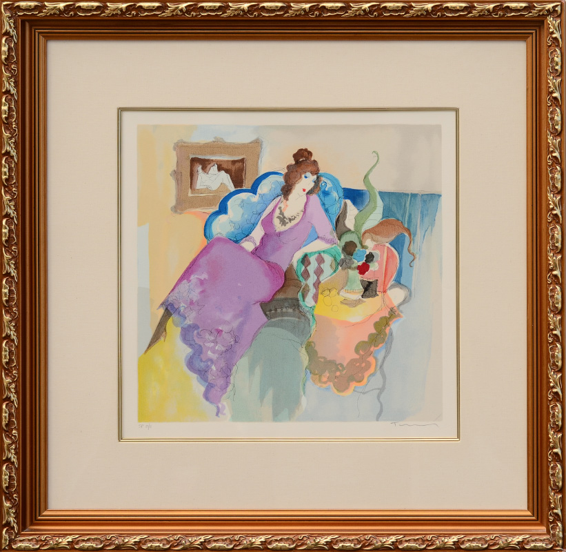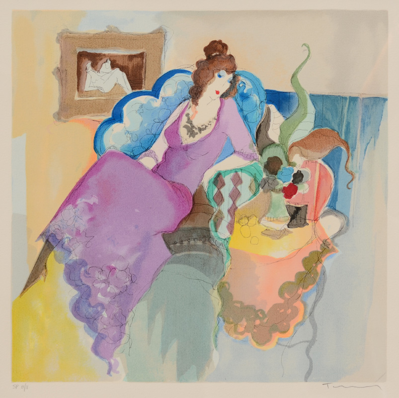 TARKAY, Itzchak, (Israeli, 1935- ): Woman in Purple Lounging, SP Color Lithograph, sight size 17 1/2'' x 17 1/2'', pencil signed lower right, marked lower left ''SP'' 8/11, framed, 30'' x 30''.