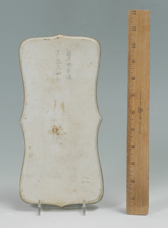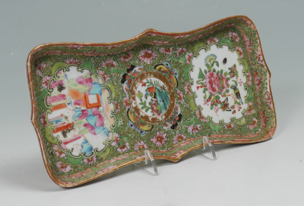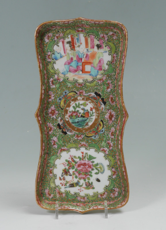 CHINESE ROSE MEDALLION TRAY: Floral decorated with interior genre scenes, bird and floral motifs in reserves. Marked on base, measures 10 1/4'' 5'' x 3/4''.