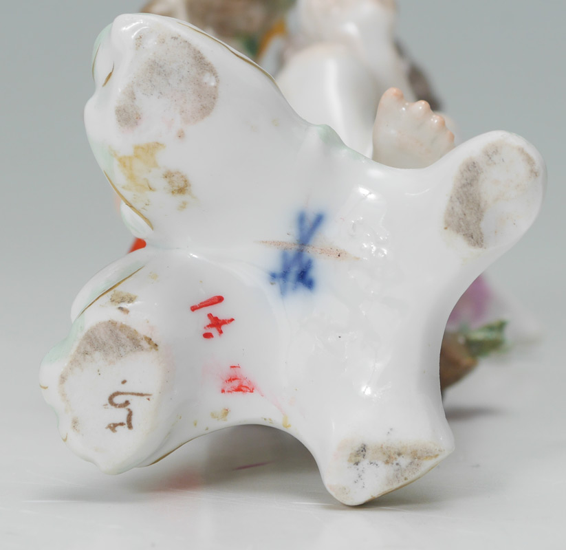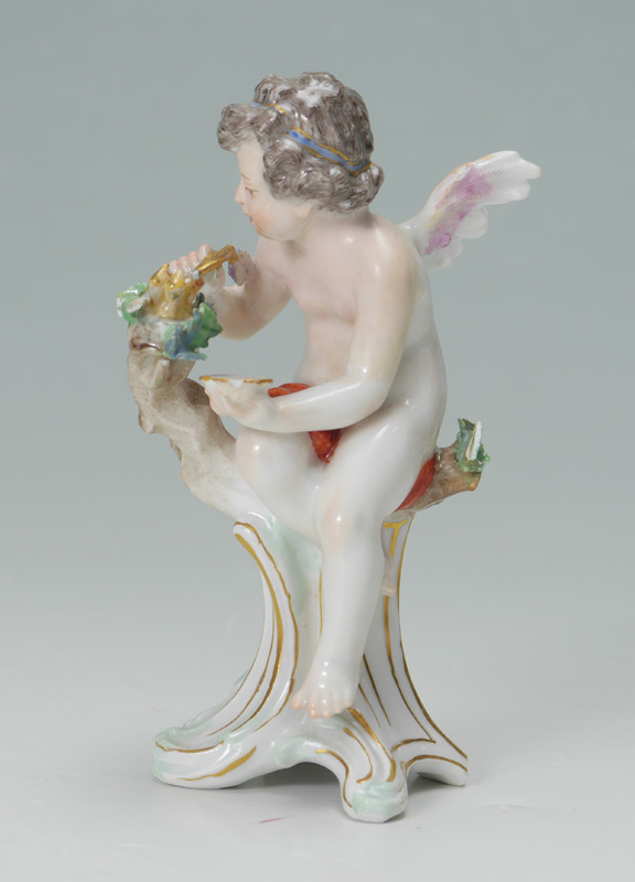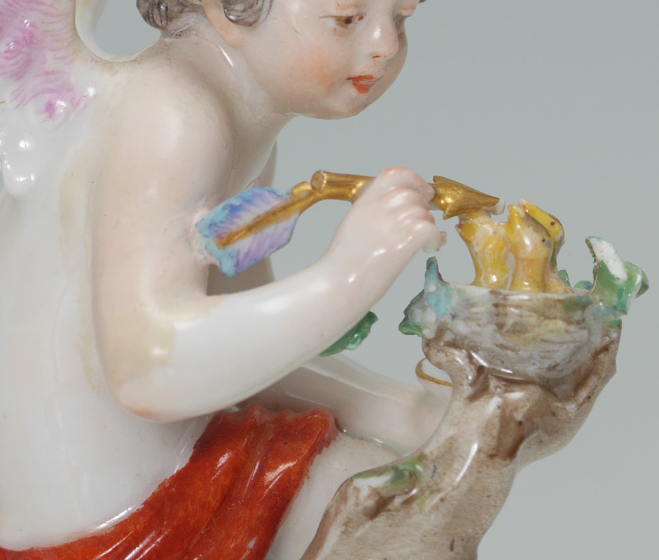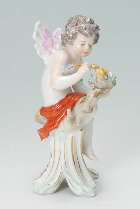 MEISSEN FIGURE CUPID FEEDING BABY BIRDS: 4.5'' tall figure of Cupid resting on a branch, feeding hatchlings with his arrow. Cross swords mark under glaze.