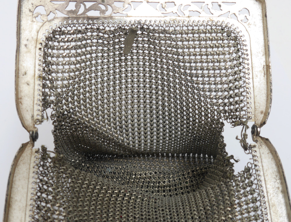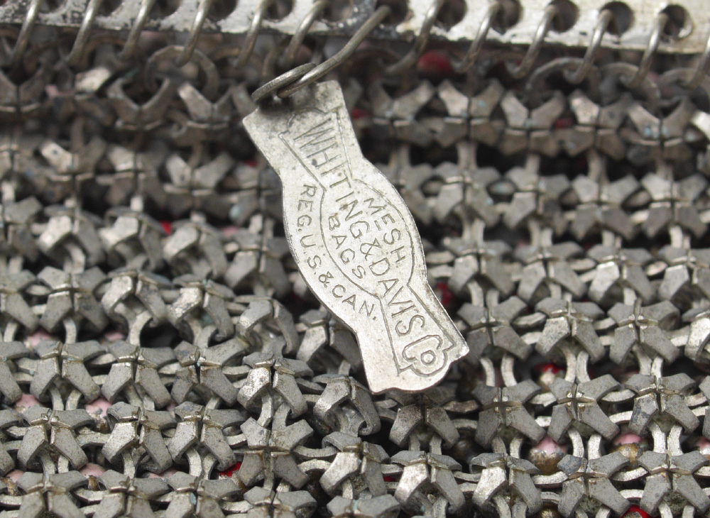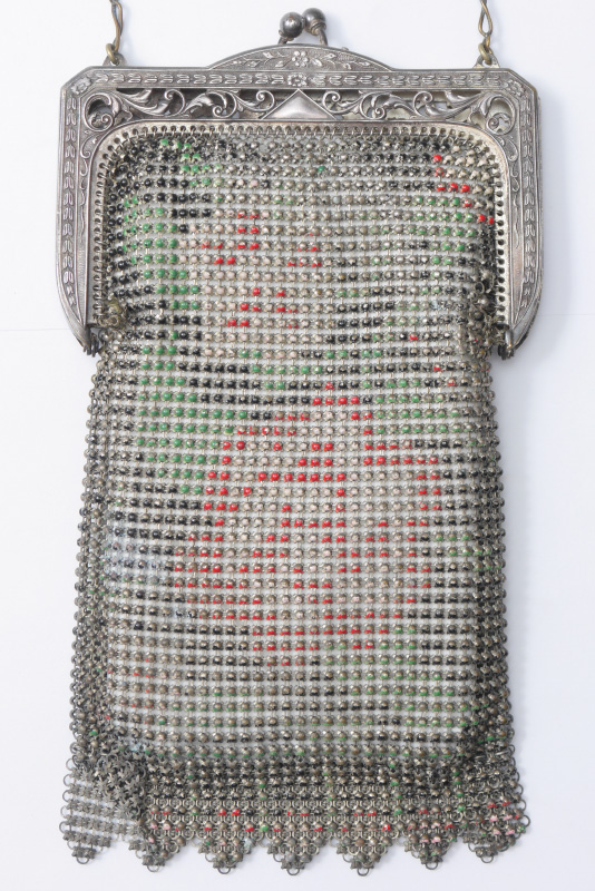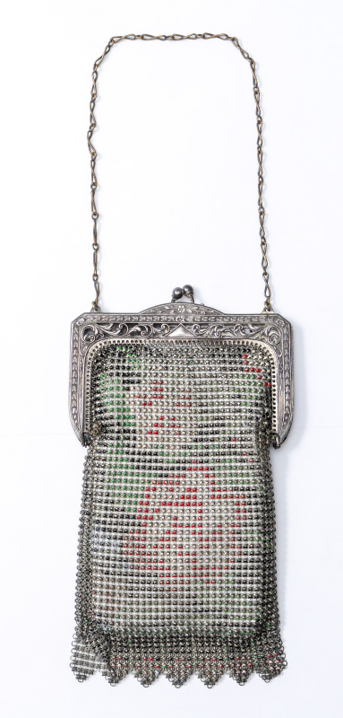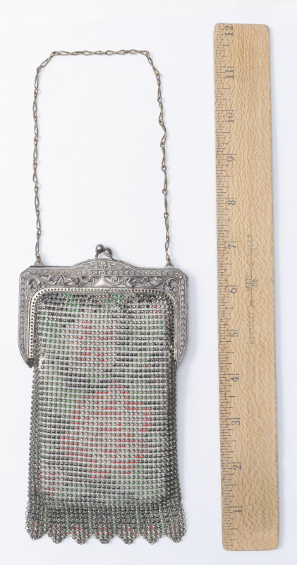 WHITING & DAVIS ENAMEL BAG IN A ROSE DESIGN: Simple rectangular shape in a lovely red rose pattern, slightly scalloped fringe, lovely embossed and filigree frame, 7'' x 3 1/2'', twisted link chain, 12 1/2''l. overall.