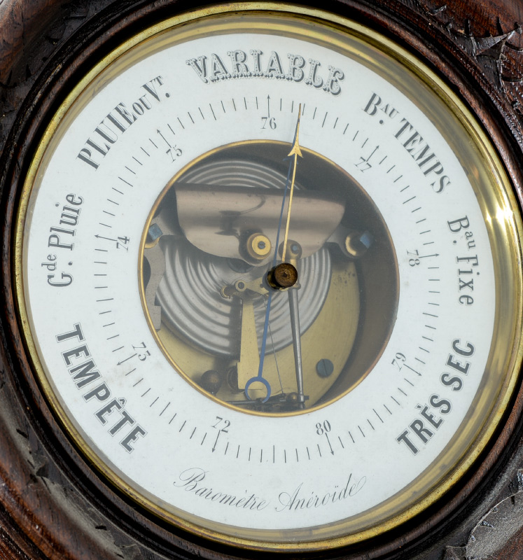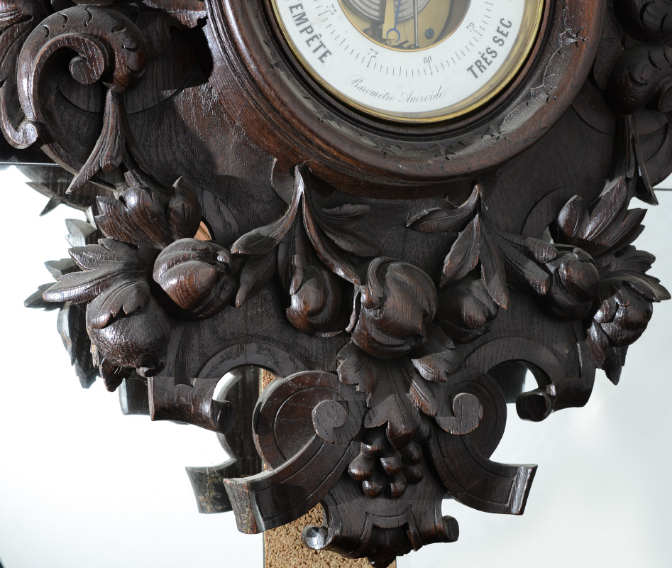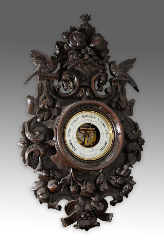 BLACK FOREST PROFUSELY CARVED WALL BAROMETER: Frame covered in carved and applied decoration featuring basket of fruit, birds, nuts, floral and foliate scroll decoration, central aneroid barometer. Overall measures 35 3/4'' h. x 22'' x 5 1/2''.