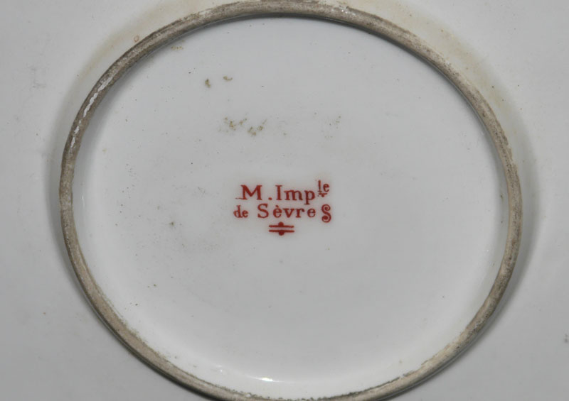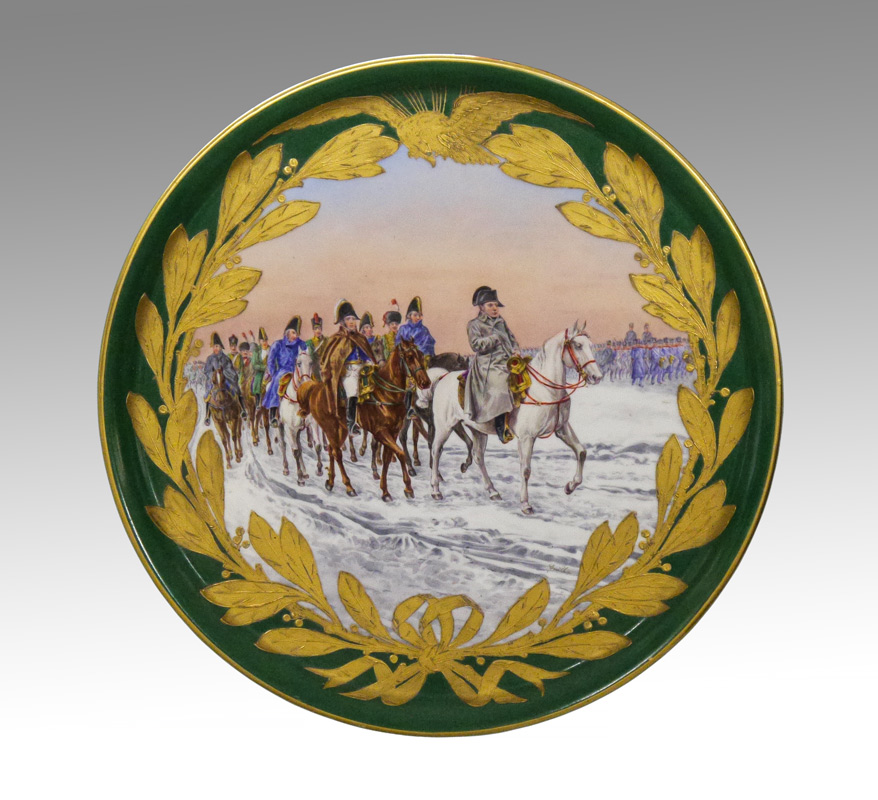 LARGE NAPOLEONIC SEVRES CHARGER: Hand painted scene depicting Napoleon leading his army in Russian Front signed Guillou, green border with gilt wreath and eagle decoration. Marked on base with red M. Imple De Sevres mark on back. Measures 1 1/2'' x 17 5/8''.