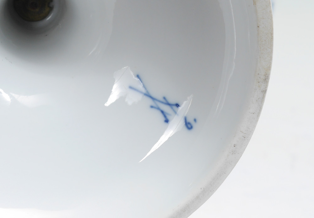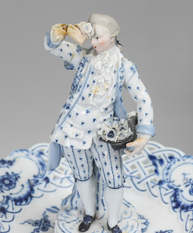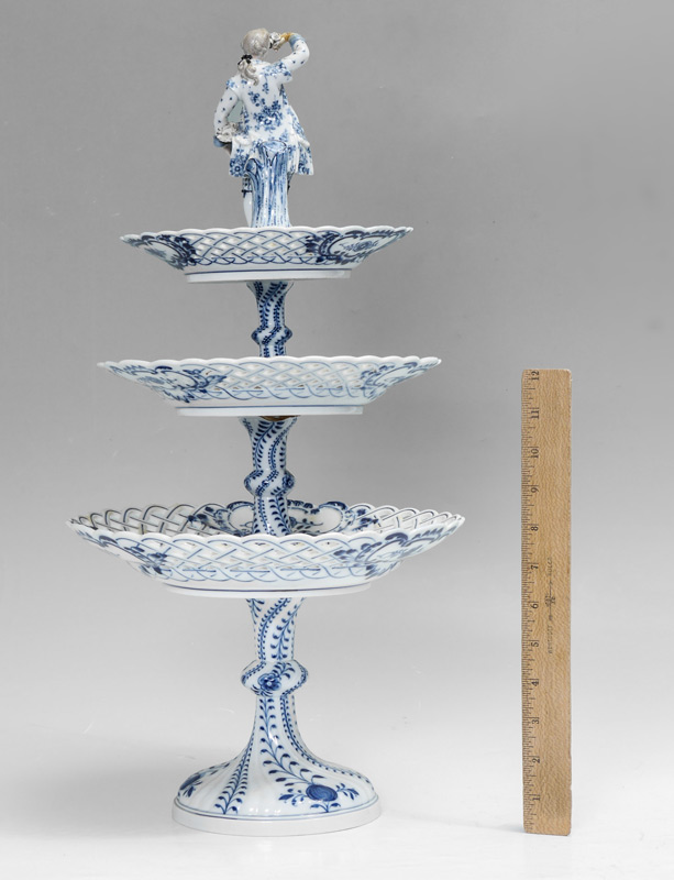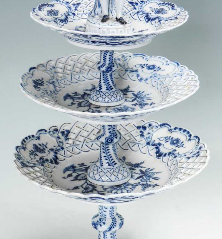MEISSEN PORCELAIN THREE TIER TABLE STAND: In the Blue Onion pattern. Three reticulated tiers surmounted by a figure of a dapper gent. Blue cross swords mark. Measures approx. 21''h x 11'' dia.