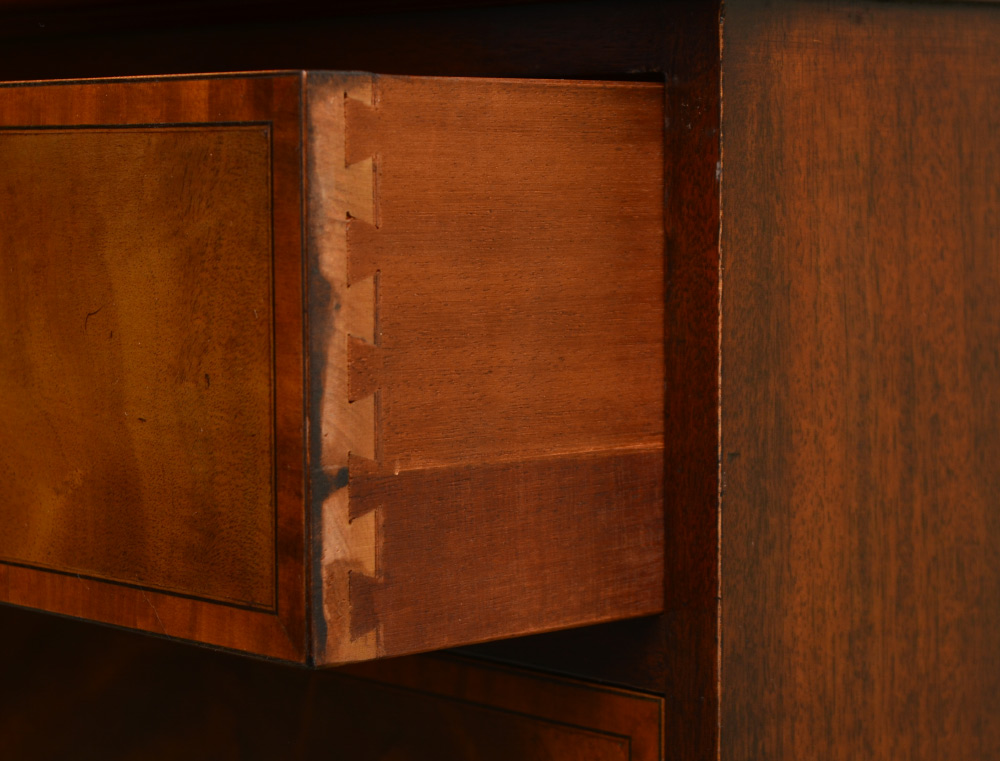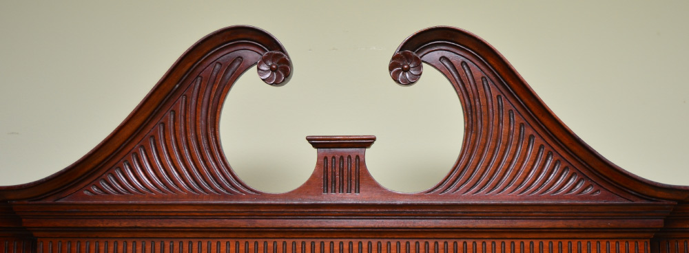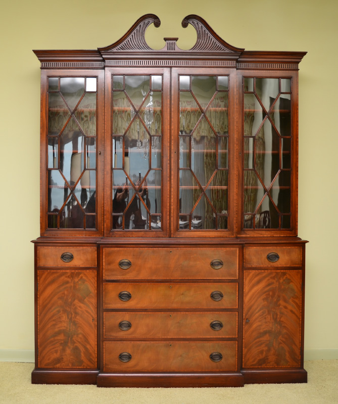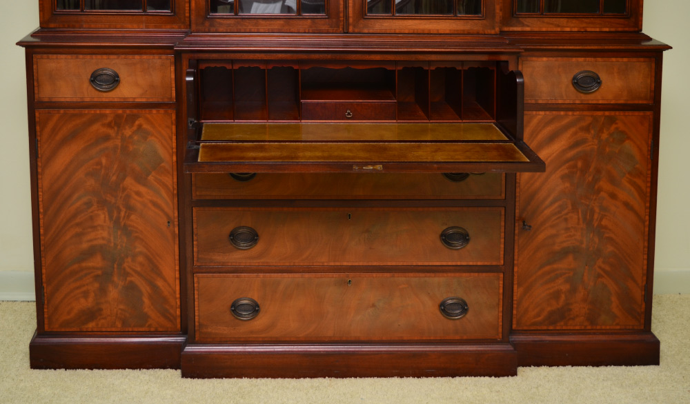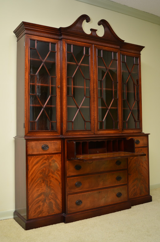 MAHOGANY CHIPPENDALE STYLE BREAKFRONT SECRETARY DESK: Original Beacon Hill label inside drawer, piece number 658. Broken arch pediment over 4 fretwork glass doors, 3 shelves each section. Base with 4 central drawers, top drawer opens to secretary desk with leather writing surface, single drawer over single door either side. Overall measures 92'' h. x 68'' x 17 1/4''.