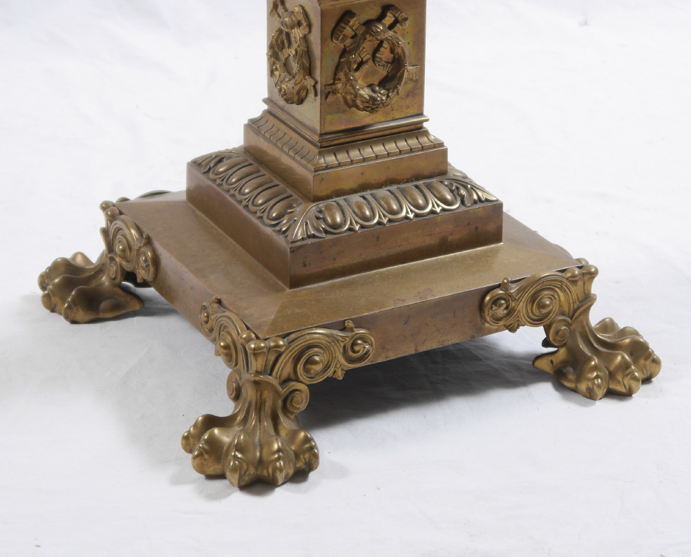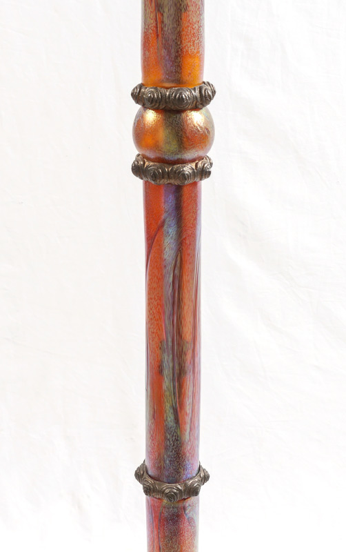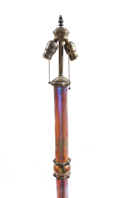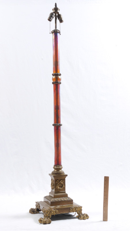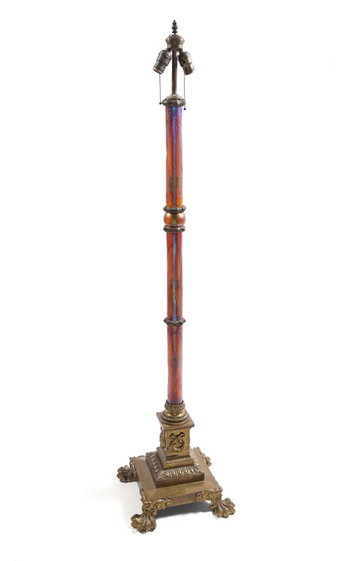 ATTRIBUTED LOETZ ART GLASS FLOOR LAMP: Body with iridescent amber glass with pulled designs gilt bronze accents. Brass base with applied gilt bronze accents and paw feet, double socket fixture. Overall measures 81 1/2'' h. x 14 1/2'' x 14 1/2''.